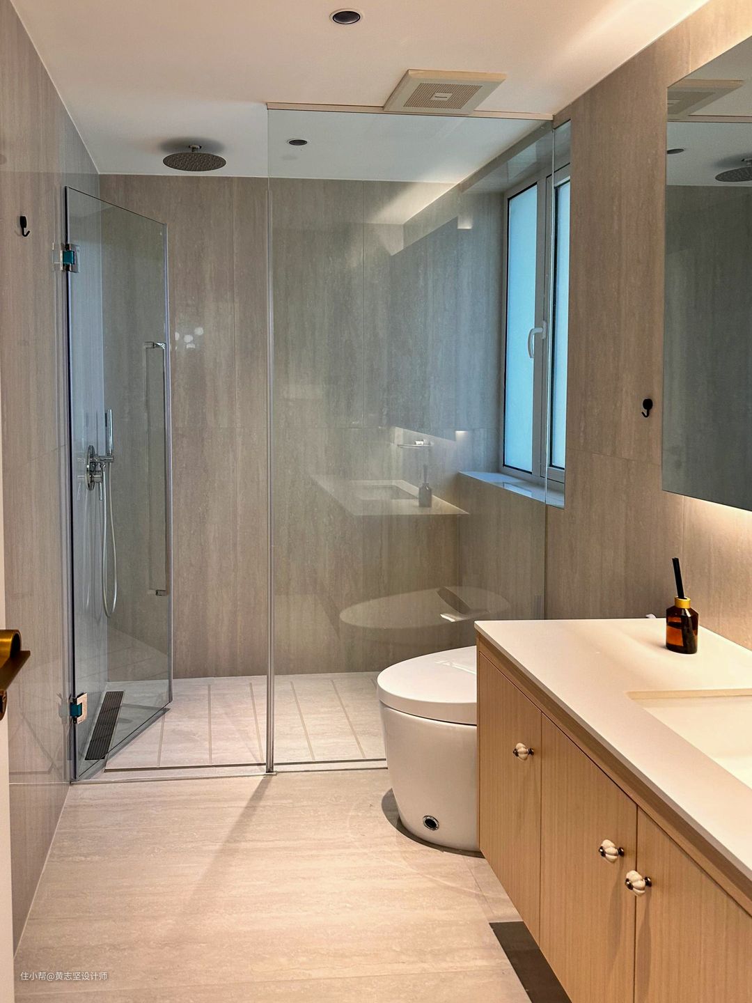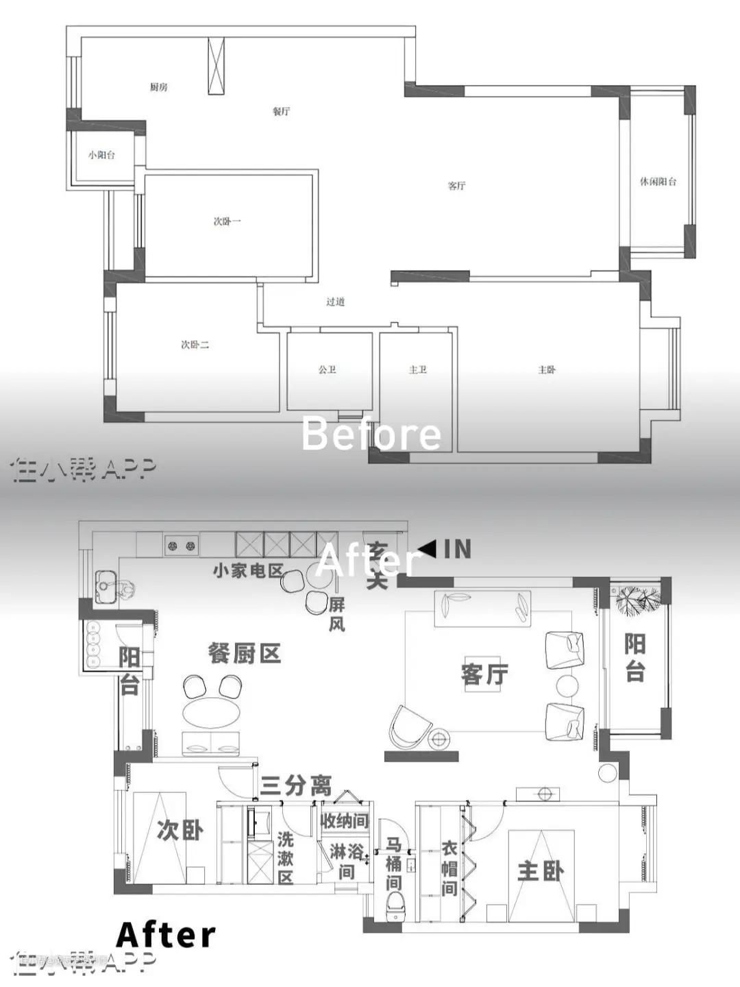 和客户沟通后,设计师做出以下改造: ❶3室改2室,打掉一个卧室,将餐厨变为开敞一体的大空间,明亮通透。 ❷原主卧墙面内移,扩大客厅空间,无法移动的结构墙用做河游动线。 ❸玄关极简化,用一面屏风隔开入户门和厨房位置,增大了厨房可用空间。 ❹卫生间改三分离,马桶间、洗衣区 + 洗手池、淋间可分别单独使用。
