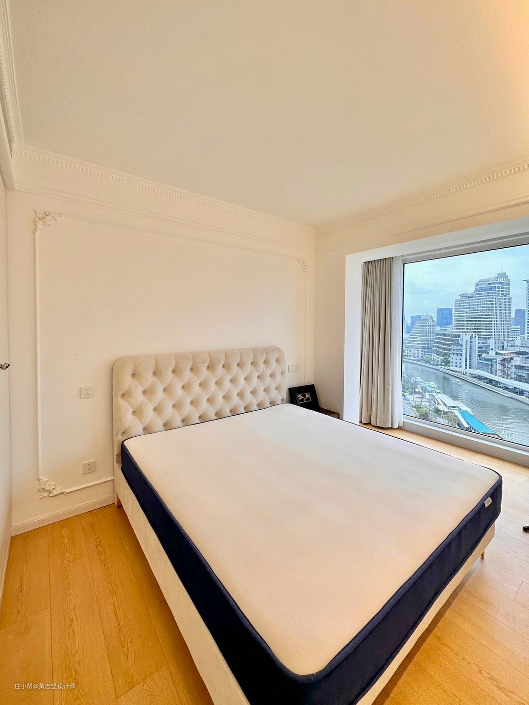 🌿全屋都是大白墙,刷的是最简单的白色乳胶漆,床头背景墙搭配的是PU线条,卧室还有一个超大的落地窗