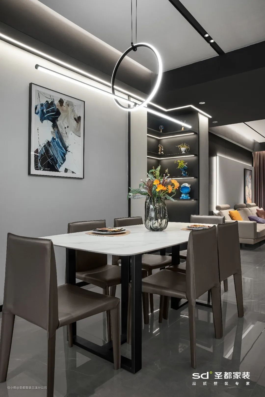 沿墙面设计了整墙餐边柜,最大化提高餐厅的储物能力;又在临近墙角处设计了玻璃酒柜,全透明的样式空灵而澄澈,搭配隐形灯带,更显质感与时尚。