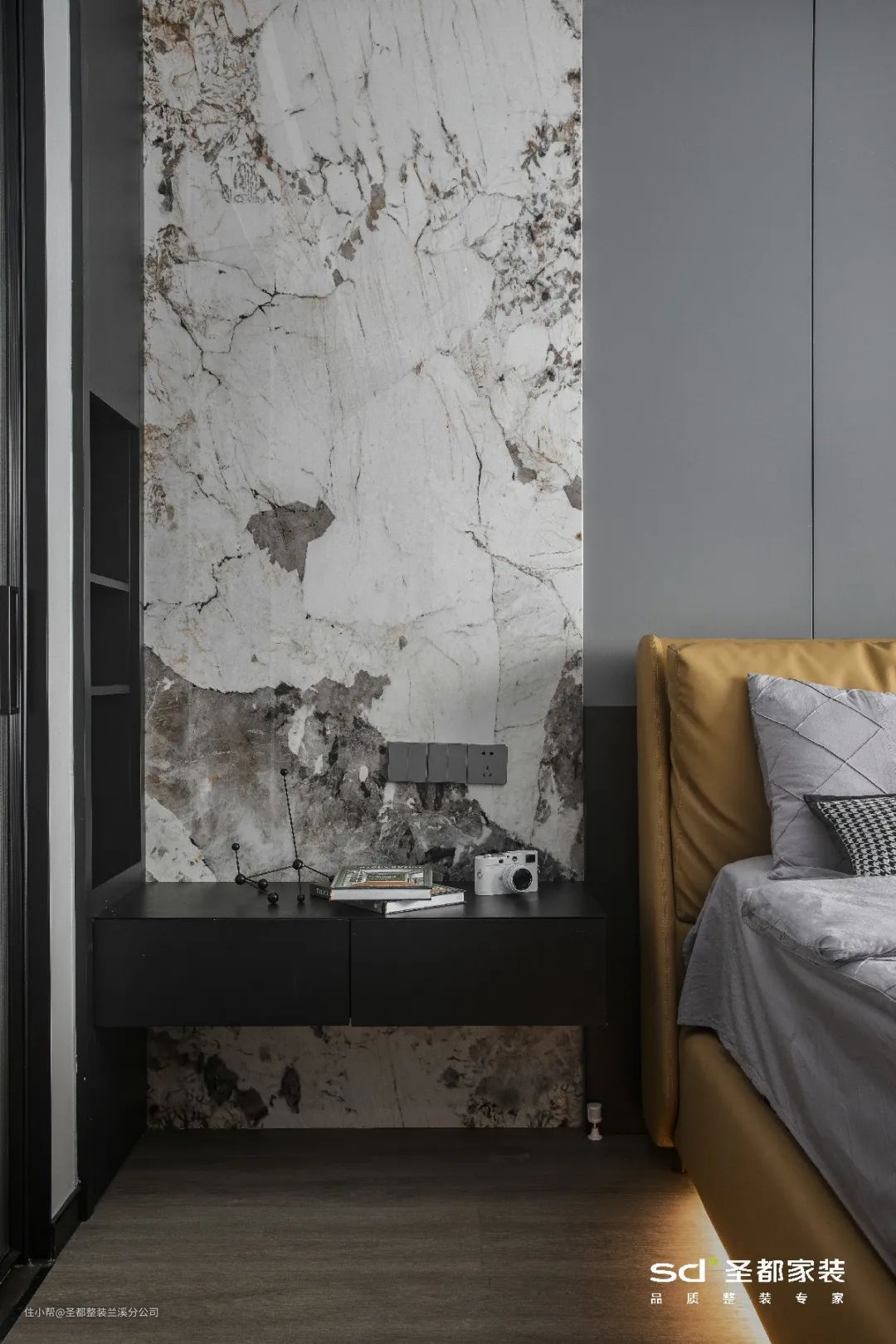 定制衣柜朝床头方向延伸出一方柜体,悬空的样式不仅拥有极强的设计感,还杜绝了卫生死角。
