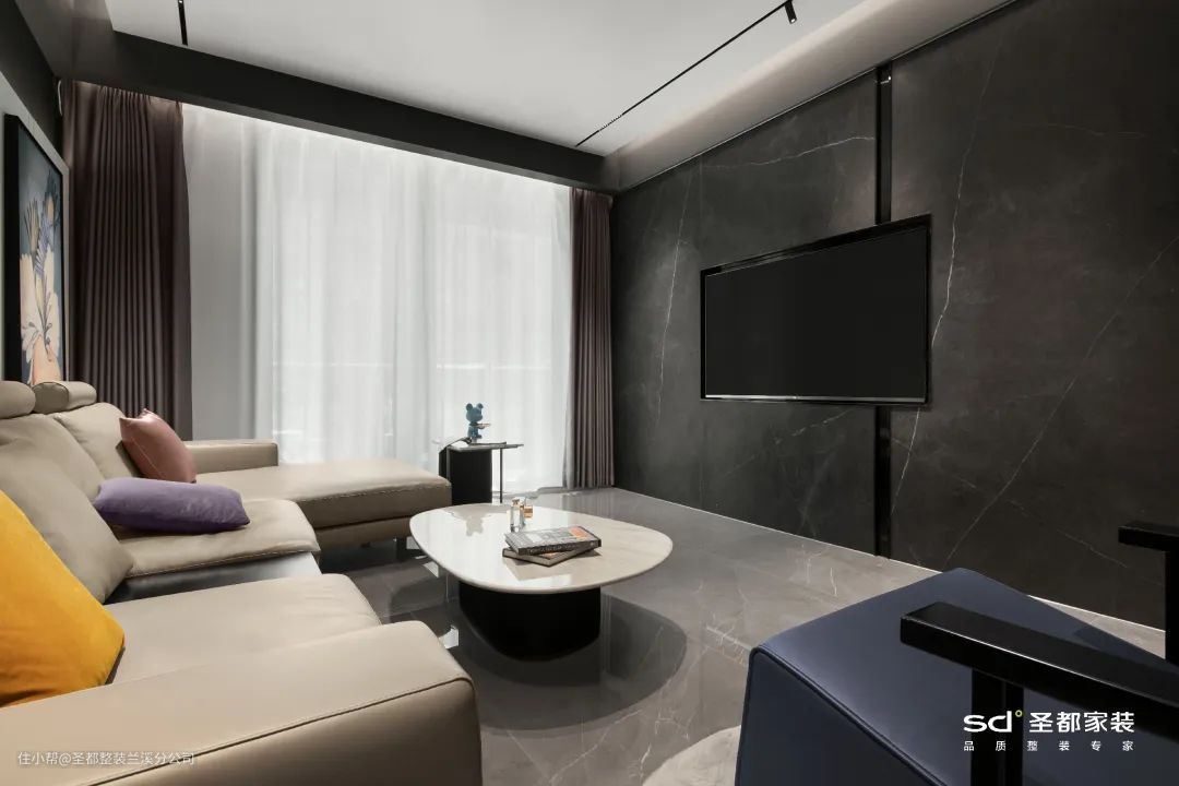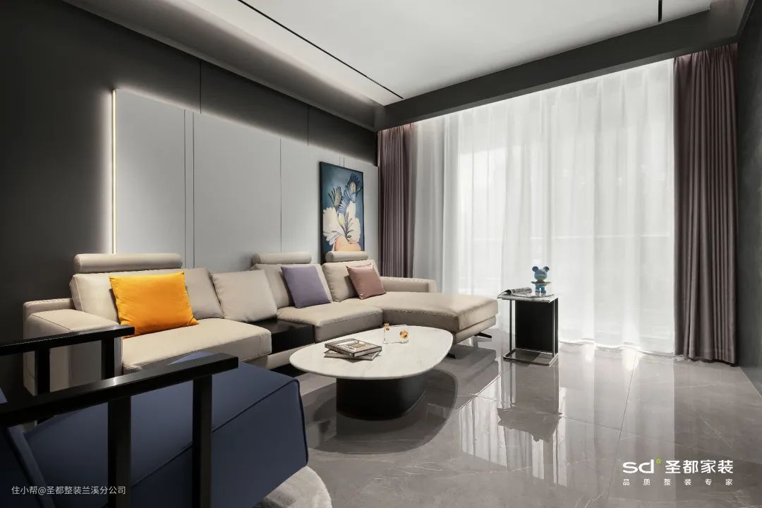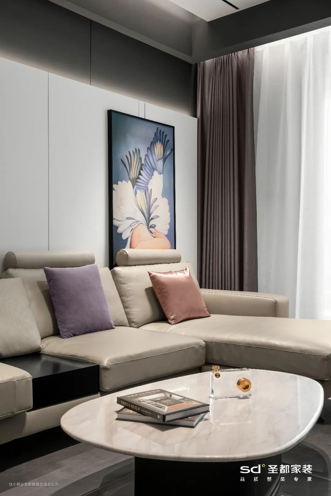 客厅以经典黑白灰为主色调,奠定下稳重典雅的基调;龙胆蓝单人沙发、香芋紫、亮橙色抱枕一起打破原本的素雅与清冷,让空间趋于明媚、柔和。无主灯设计开启散点照明模式,烘托出光影绰绰的氛围感,为空间增添趣味性与艺术感。