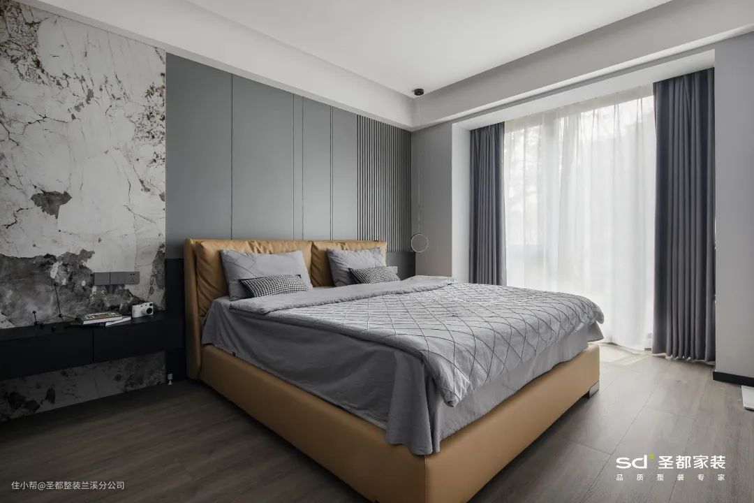 主卧以低饱和度的色彩勾勒出温柔内敛的睡眠环境。绅士灰床头背景墙上悬下一只圆弧简约灯具,映射出淡淡的光晕,丰富着私密空间的品质感。