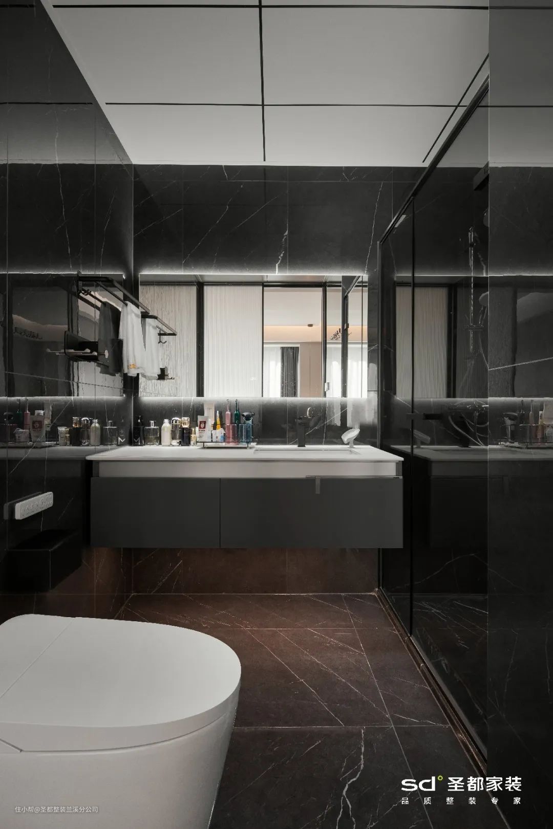 卫生间以深色系为主色调,显得沉稳得体;材质上选择耐用的大理石,方便日常打理。