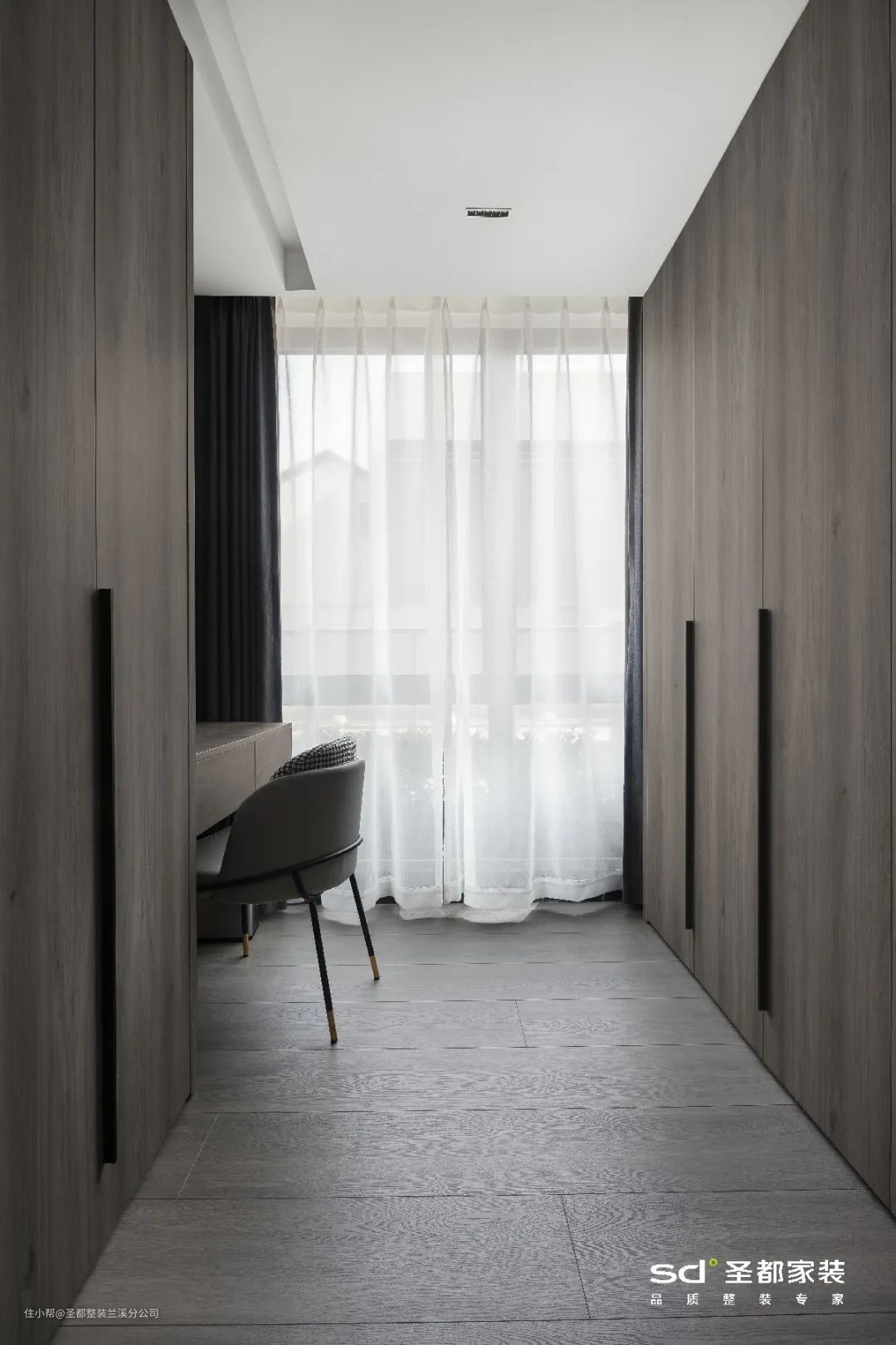 为了进一步提高空间利用率,衣帽间定制两排顶天立地式收纳柜,又特意在左侧临窗处预留下一张书桌的位置,让衣帽间兼具书房的功能。