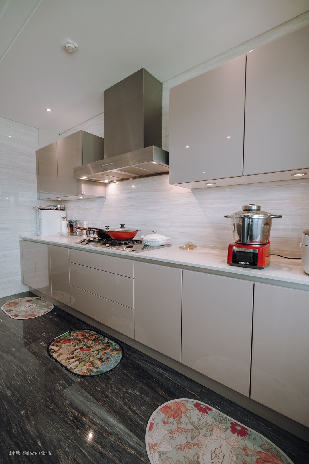 厨房设置了中厨加西厨,满足男女主人享受烹饪的乐趣。地面通铺一体式的灰色瓷砖,延续现代风的精髓,耐脏耐看。再搭配上香槟酒的橱柜,让视觉效果更加饱满。 吧台设置在西厨与中厨中间位置,能容纳多人同时操作,增加了家庭成员间的互动与交流,让烹饪变得更有乐趣。白色大理石吧台与墨绿色高脚椅,呈现出简约轻奢的空间调性,浪漫又包裹着烟火气。 中式厨房台面以一字型结构打造,将操作台、烹饪区、装盘区均沿着墙面一字排开,布局简洁明了,加上各种筒灯点缀,为烹饪提供充足的照明。嵌入式的家电设计,提高空间利用率,使厨房更加整洁有序。
