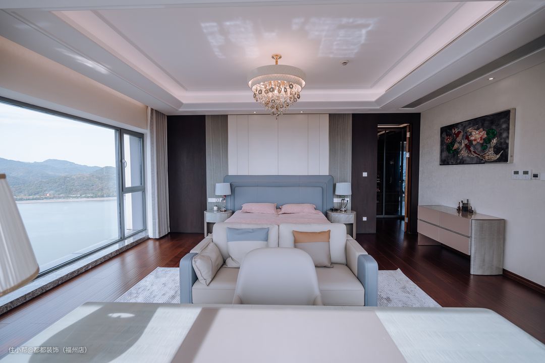 卧室也是有着两面的海景窗户,白天能将海天一线尽收眼底,每日早晨皆能被阳光海景温柔地唤醒。 床头背景墙是深浅不一的木饰面板,同时以对称形式打造,加上金色线条点缀,尽显奢华之感。中间布置上一张蓝色的双人大床,搭配粉色床品,少女心十足,轻松营造出静谧温馨浪漫的睡眠氛围。床尾另设白色皮质沙发,用于日常生活中的休憩,感受临江的美景,岂不美哉? 办公台就设在床尾处,装上浅白色的书桌和办公椅,办公桌对朝大海,工作累了抬头就能看到海景,为主人提供了一个实用方便而轻松的工作空间。 衣帽间采用玻璃推拉门,既能防尘,也不影响采光,衣物更是一目了然,轻松搞定每天穿搭。柜体内嵌灯带,格调直接拉满。柜子内部挂衣区、叠放区、展示区分区明确,储物功能性强。