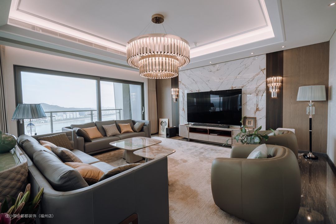 客餐厅均采用希腊灰进行通铺,样式大气时尚,密缝连纹的效果让视觉效果得到无限延伸。客厅与阳台利用大玻璃+平开窗的组合设计隔断开,透光效果更高,视野也更好,当清晨的每一缕阳光透过落地窗照射进来,带来一种温馨而治愈的感觉。 深灰色的皮质沙发辅以棕色抱枕,沙发再暖色地毯的基础上以U型造型摆设,形成一个区域,适合一大家子或客人一起围坐喝茶聊天。双眼皮吊顶结合香槟金的水晶吊灯,同时以边条作为勾勒,线条感十足,轻松营造低调的奢华气质。 电视墙面用了白色大理石材质打造,辅以金色纹理,两侧对称式的木饰面板和水晶壁灯,再加上画饰、台灯、绿植等细节的点缀,使得空间更显奢华温馨感。