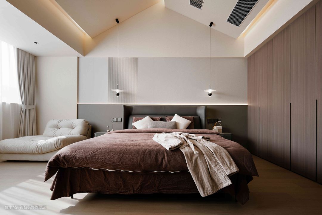 特别要提到阁楼的吊顶设计,趣味性十足。烟熏胡桃木皮定制柜,与浅米艺术漆应和承转,舒适且不失品质。望向床尾,胡桃木隐形门内是泡澡间,避免破坏整体感。