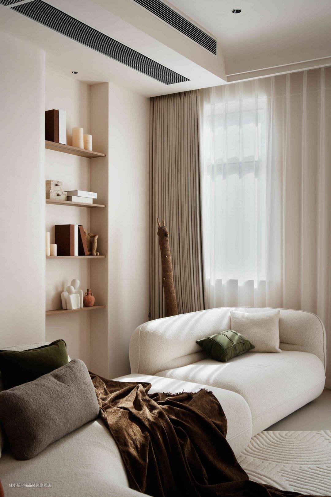 墙壁转角、家具、摆件采用大量的曲线元素来营造空间的节奏感。布艺沙发、短毛绒地毯,触手可及的柔软。读一本书,看一场电影,享受难得的松弛意境。