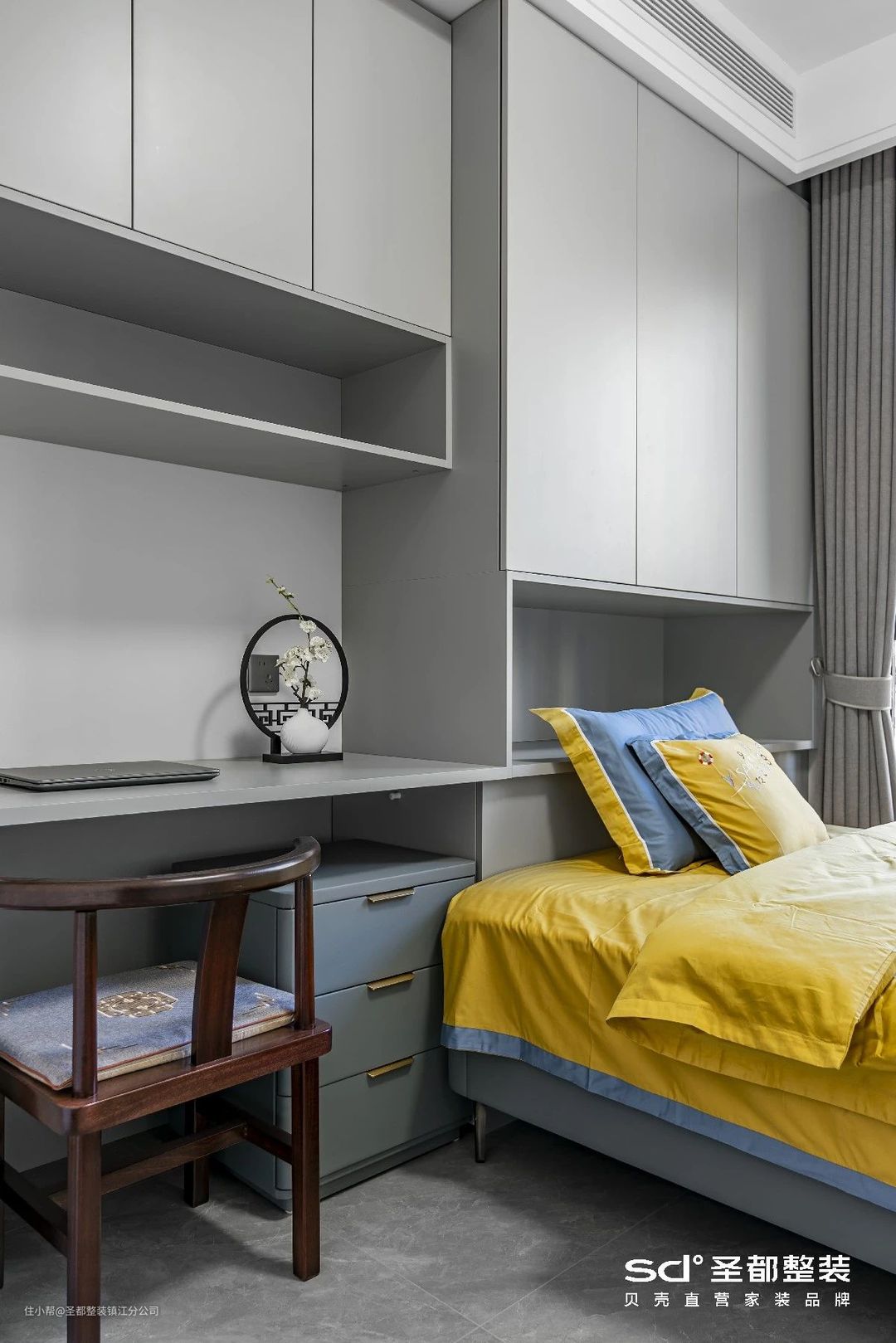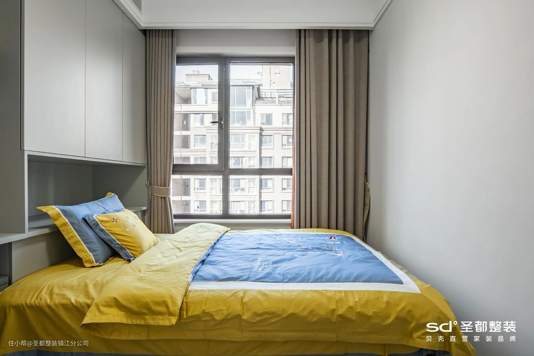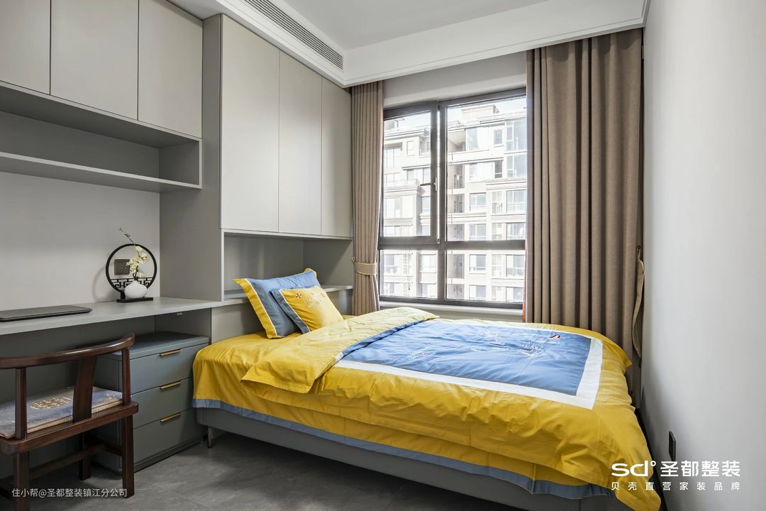 儿童房的规划,不能仅仅囿于卧室设计,还得考虑到收纳和学习。整墙收纳柜、一体式书桌一应俱全,进一步拓展儿童房的功能性。