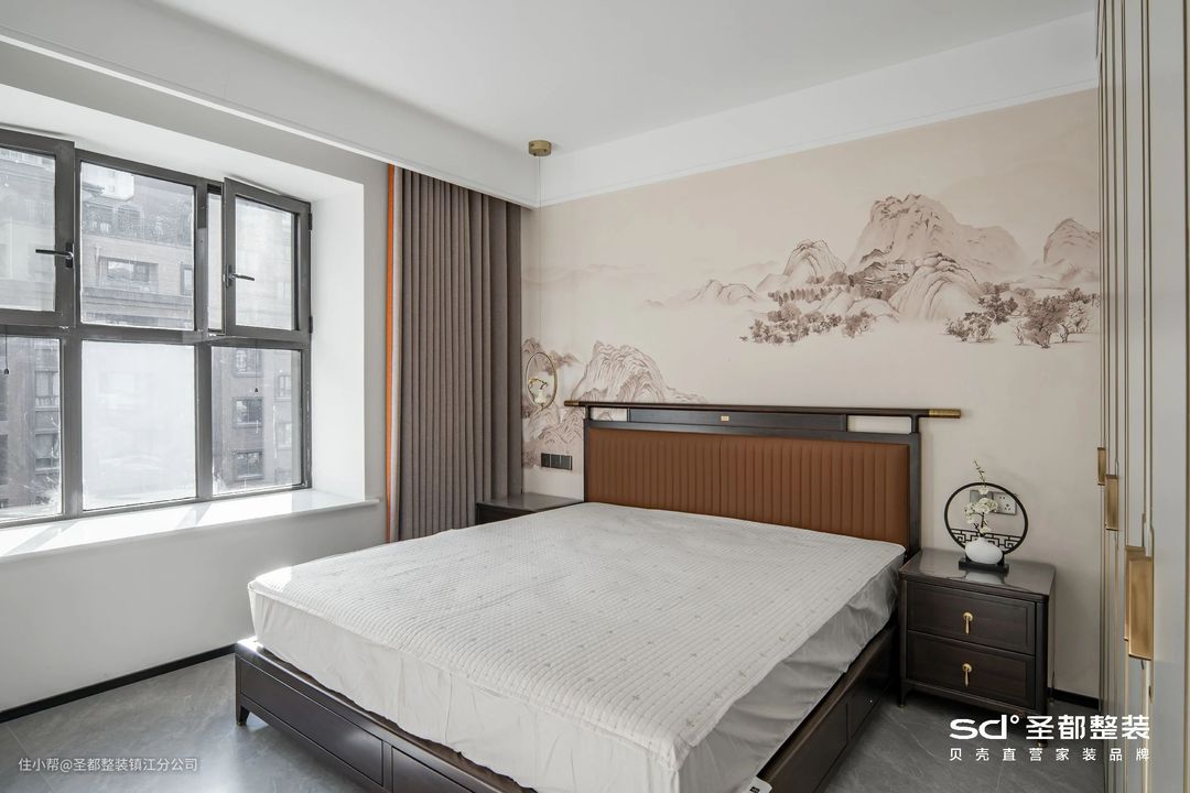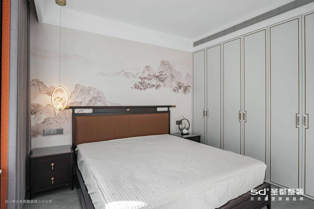 步入主卧,目光所及之处,全然一副不俗不媚的内敛模样,低调诠释出中国传统文化的谦逊与平和。生造L型衣帽柜,不仅实现了女主人对衣帽间的向往,还能能将休息空间与主卫完美划分。另外,晨起洗漱后直接在此换衣,动线简洁流畅,生活更高效。