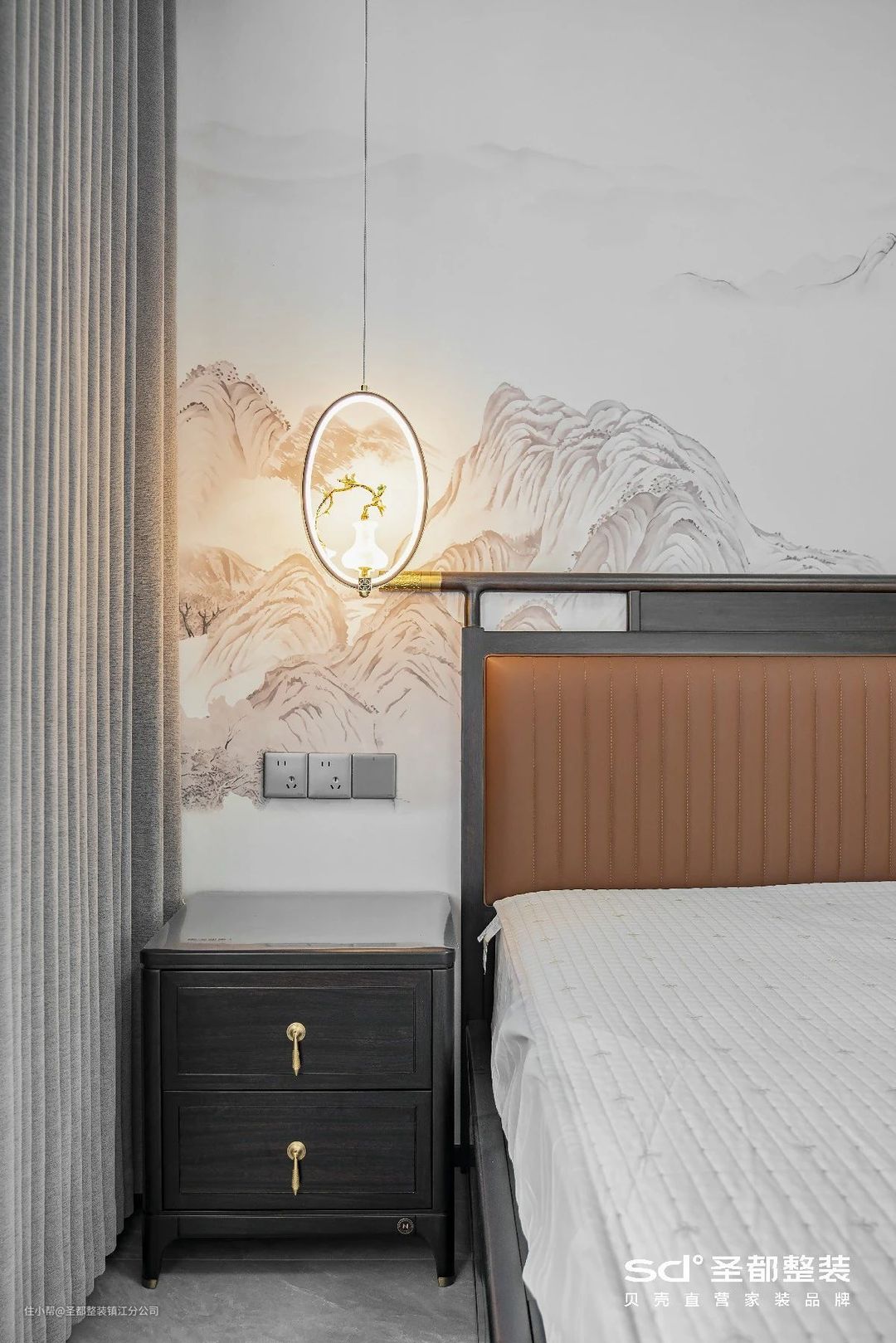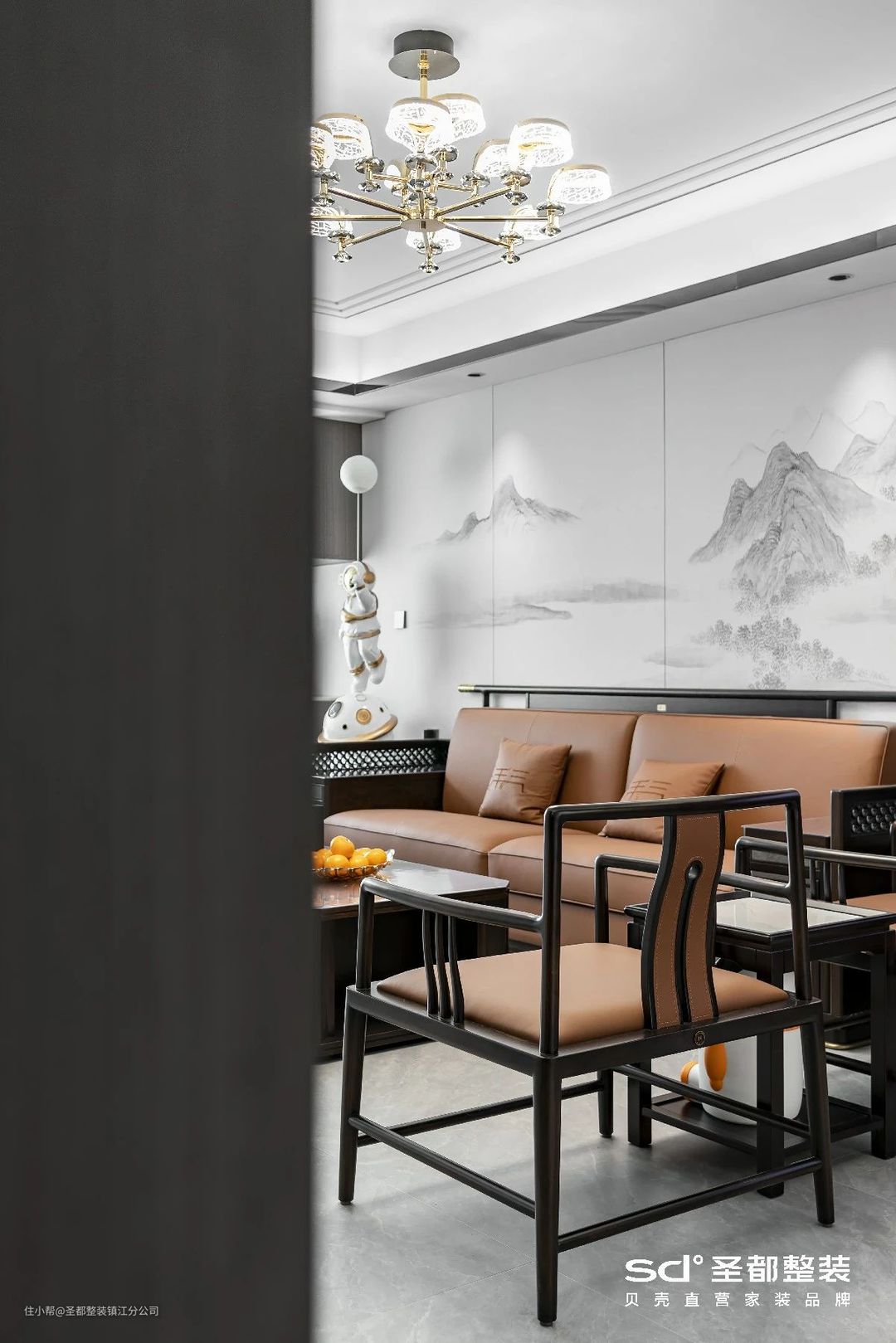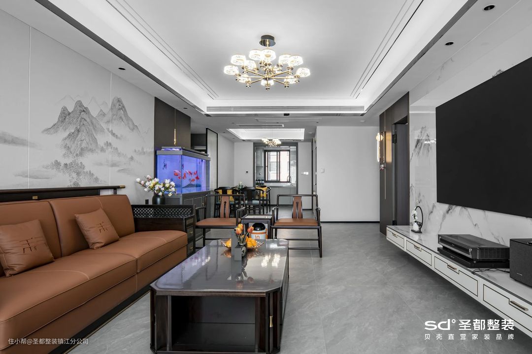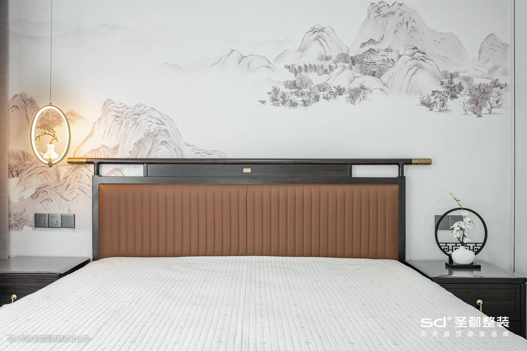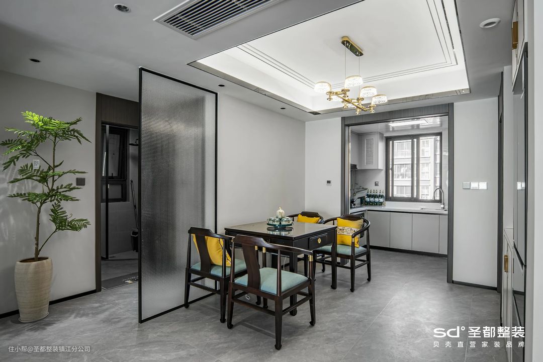 中式设计注重平和与对称,设计师在此基础上融入了长虹玻璃、丝绒等现代元素,泼墨成画,言有尽而意无穷。
