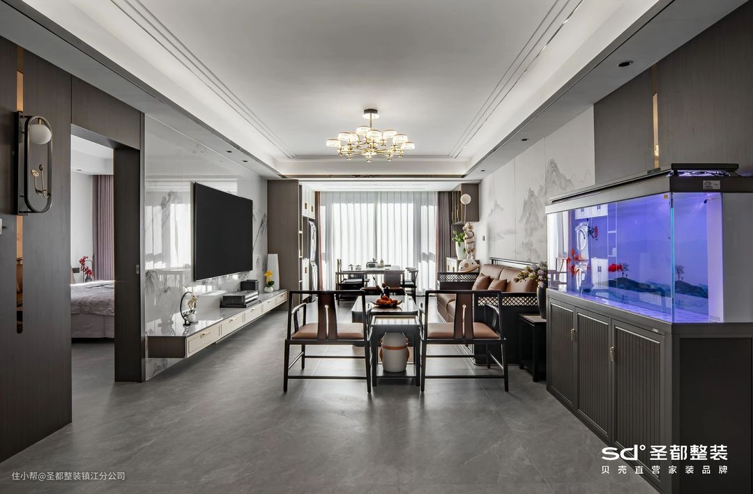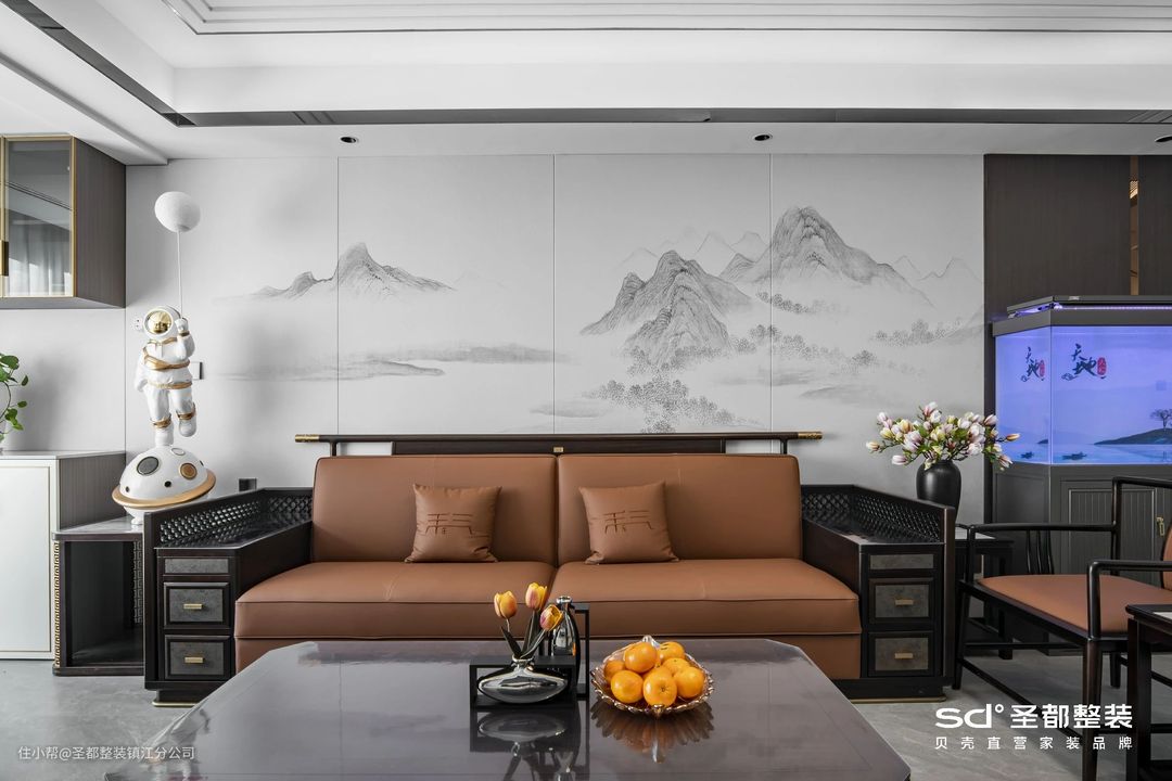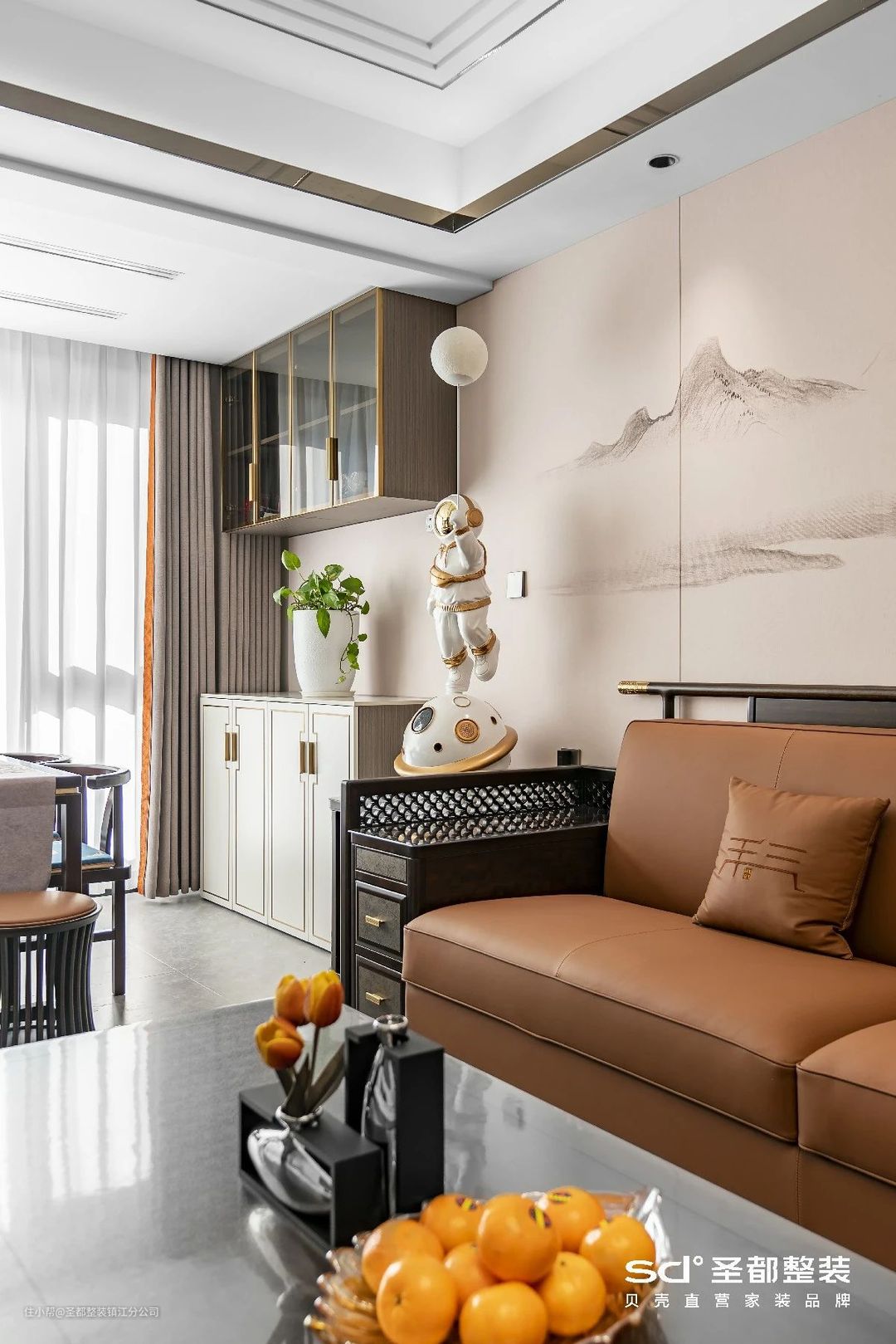 选用禅意白、典雅黑为空间主色调,并在局部中运用朱砂橘的亮色加以点缀,既不失传统文化的典雅大方,又能多一分现代的鲜活明朗。客厅阳台一体化,扩大采光面,形成舒朗开阔的空间布局。阳台设计成多功能区,实现空间0闲置:顶面规划隐形晾衣架,一键解决晾晒问题;墙面定制收纳柜,轻松扩容;临窗安置小茶室,听风品茶,人生乐事。