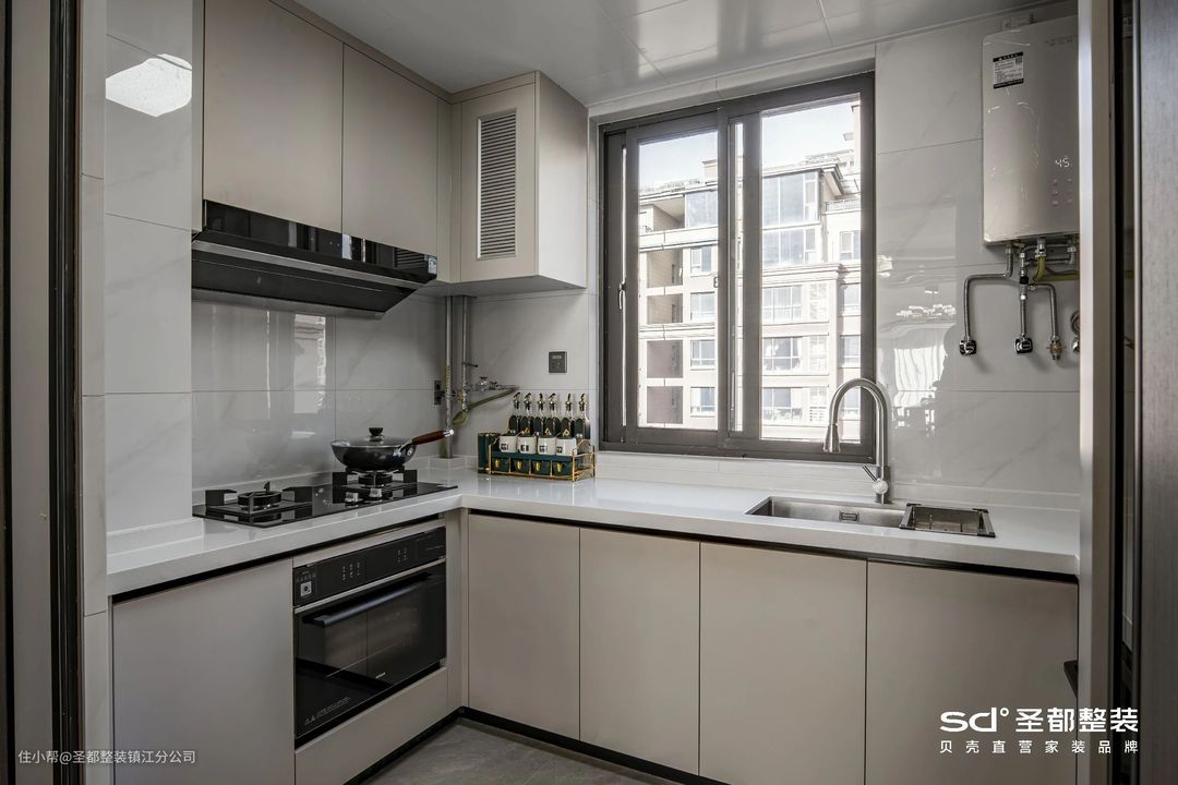 原户型中,厨房面积偏小,设计师以浅色系打底,搭配玻璃推拉门,在视觉上起到放大空间的作用,不显压抑和逼仄;U型橱柜+嵌入式家电,让小厨房也能拥有超强的收纳力。
