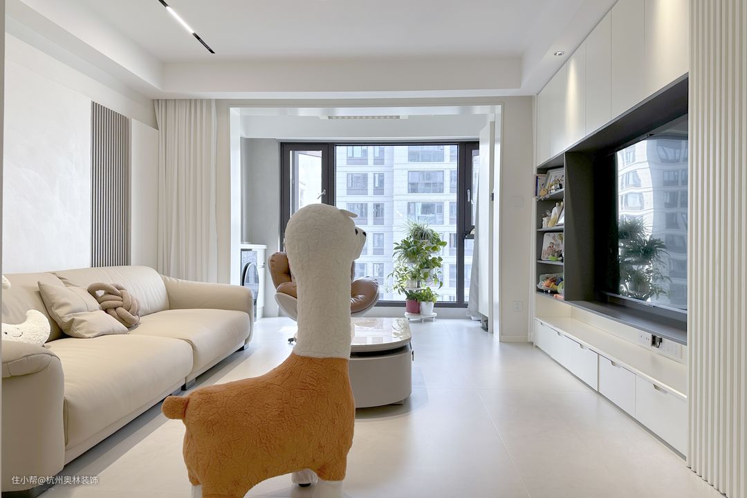 整体采用极简主义设计, 营造出干净、宽敞的空间感, 客厅的电视墙、展示架都展现了良好的储物空间。 沙发等家居的选择都使用了简洁现代化的设计, 与整体风格相得益彰, 进一步提升了整个客厅的时尚感。
