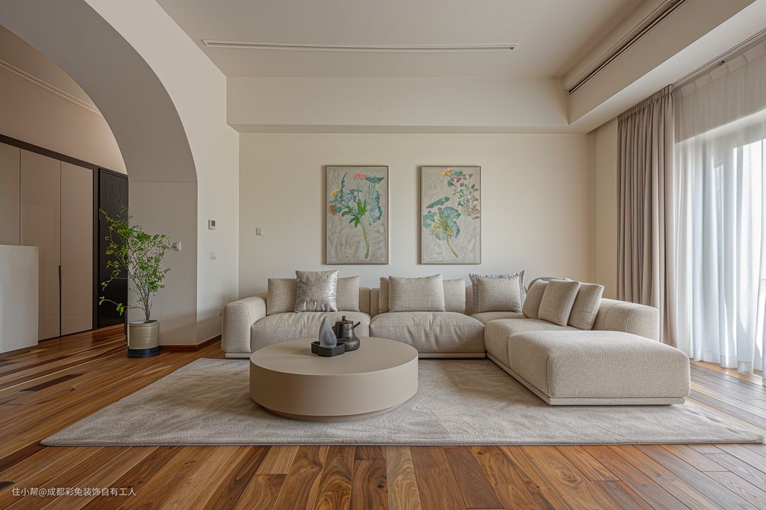 咱这客厅哇,那可是有讲究哩!你看那弧形门隔断,多稀罕了,把空间隔得恰到好处,还特别有美感。那大面积的浅色地毯,踩上去软乎乎哩,就跟踩在云彩上一样。还有那挂画装饰,一下子就让这客厅有了文化气息。再加上那圆形茶几,又实用又好看,真是美哩很!