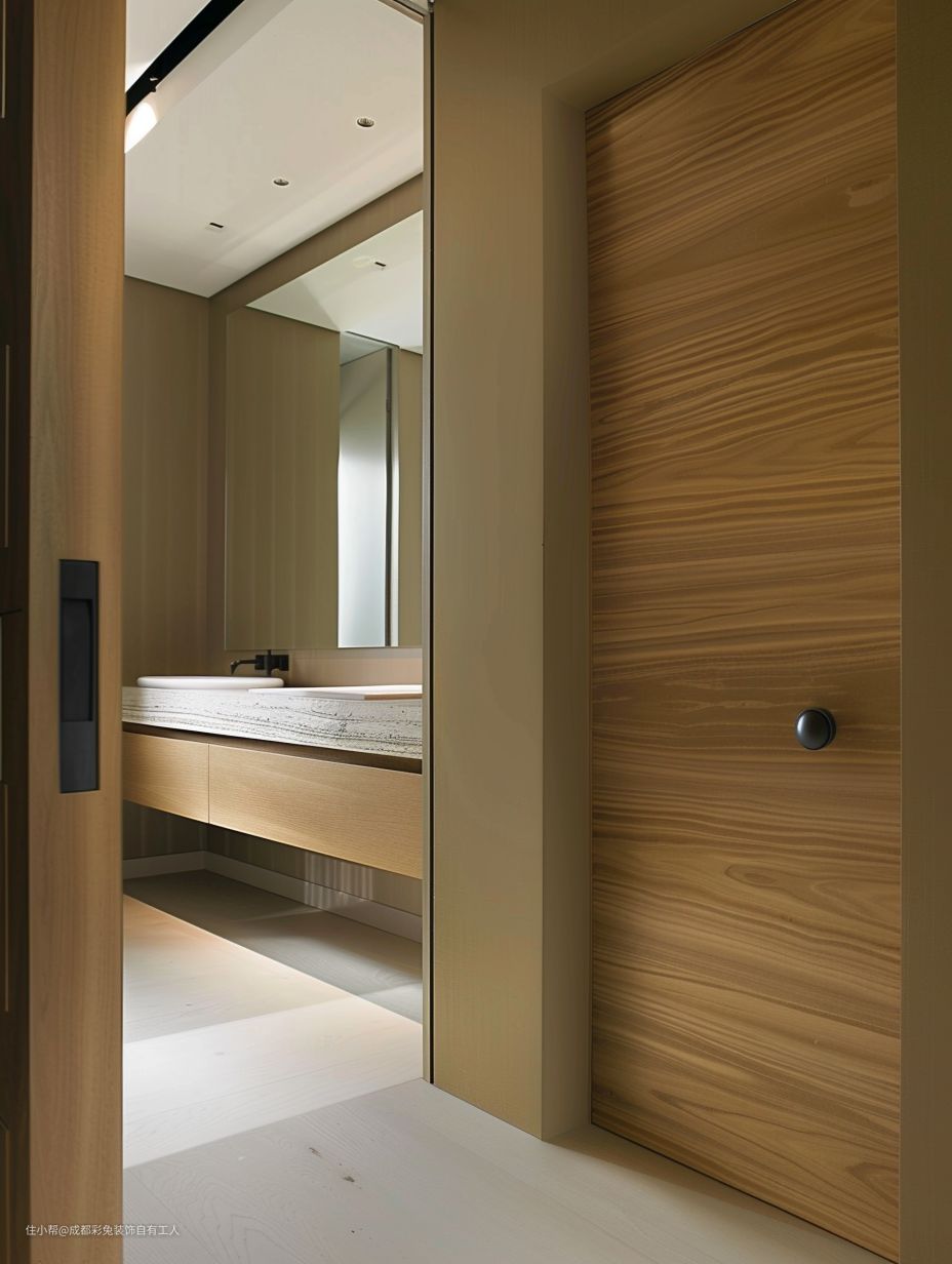 咱这卫生间,柔光砖铺贴,那感觉可不一样哩。悬空浴柜好看又好打扫。这干湿分离哩设计,可实用哩。还有那木质门,看着就有质感。