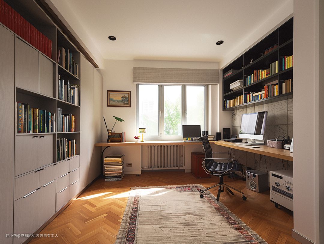 这书房哩嵌入书柜,能放好多书哩。那书桌上方哩吊柜书柜,也实用哩很。L 形书桌靠窗,采光可好哩。