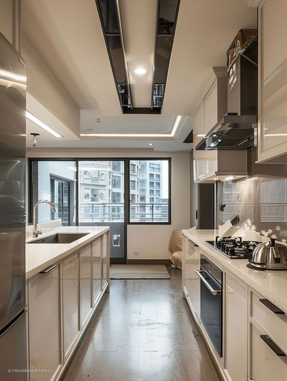 咱这厨房可不错哩,嵌入冰箱不占地方,二字布局做饭可方便哩。这木地板也好打扫。还有那台下洗碗槽,实用哩很。