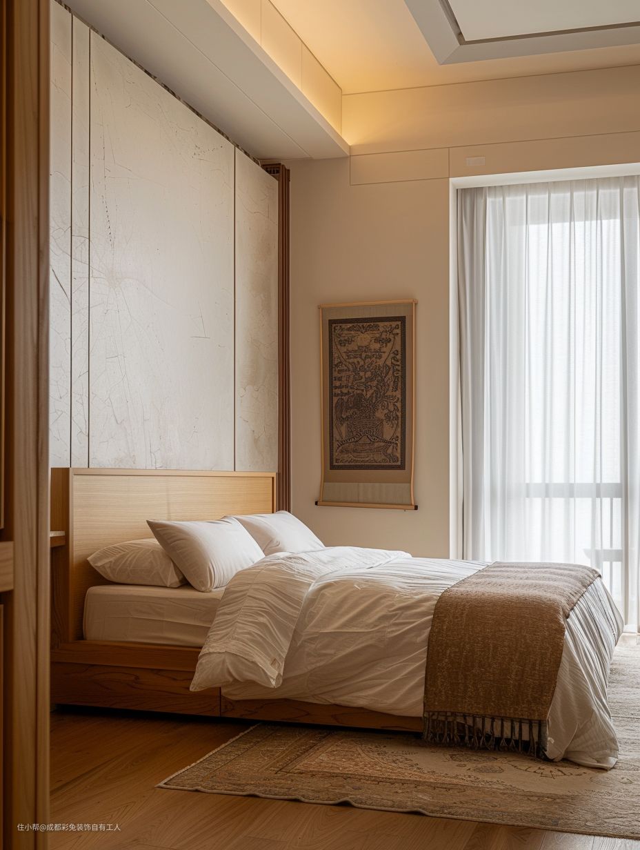 次卧哩白色纱帘,可仙哩很。还有那木质床和木地板,看着就舒服。再铺上地毯,可温馨哩。