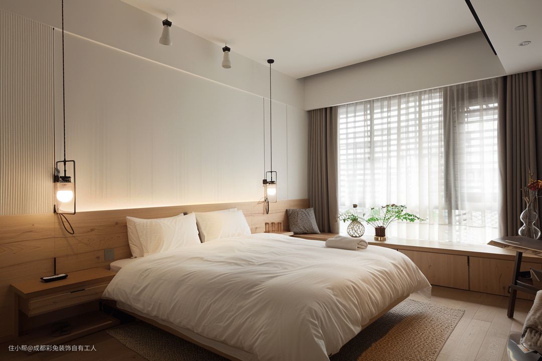主卧哩床头吊灯,那晚上一开,可温馨哩。这木质床头靠背,靠着舒服哩很。还有把那飘窗改成木质储物柜,能放不少东西哩。再摆上一盆绿植,可美哩。