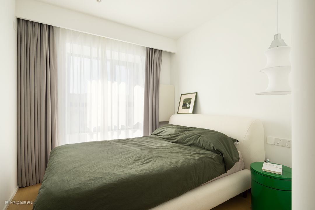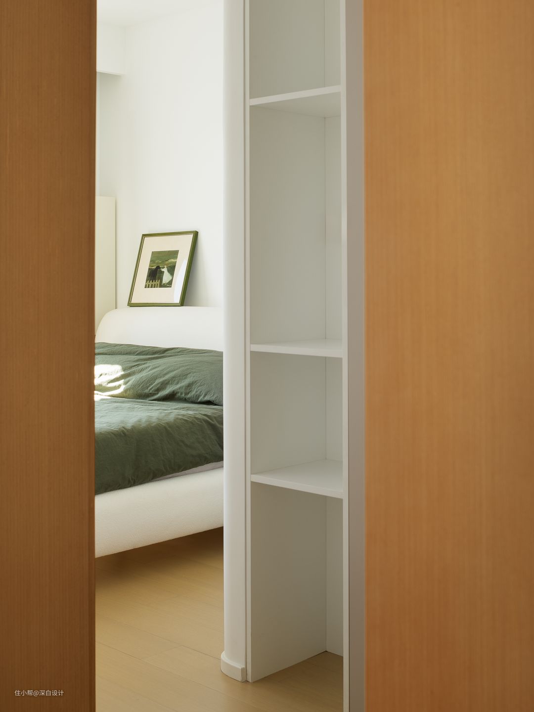次卧的设计简约而实用,进门右手边的白色开放格提供了额外的储物空间,方便整理和存放物品。床边的绿色圆形边几与床品相呼应,为房间增添了一抹清新的色彩,同时也提供了放置物品的便利空间。整体布局简洁明快,打造了一个舒适宜人的休息环境。