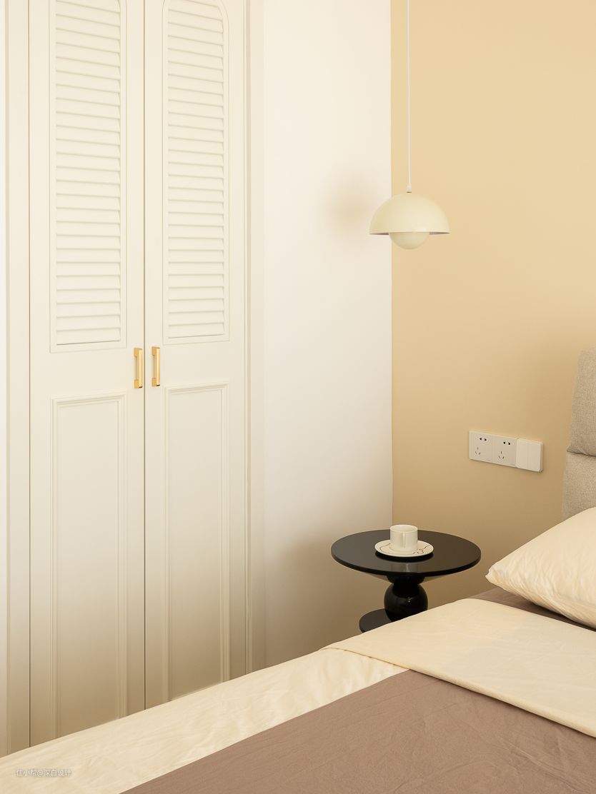 主卧采用了淡黄色的墙漆,营造出温馨舒适的氛围。米色软包双人床与黑色边几相搭配,展现出简约而不失优雅的设计风格。床头的黑色边几提供了便利的放置物品的空间。 左侧的衣帽间通过一道门相连,提供了私密而便捷的储物和更衣空间,让生活更加舒适和便利。整体设计简约大方,营造出宁静而温馨的休息环境,在疲惫一天后能够得到充分的放松和休息。