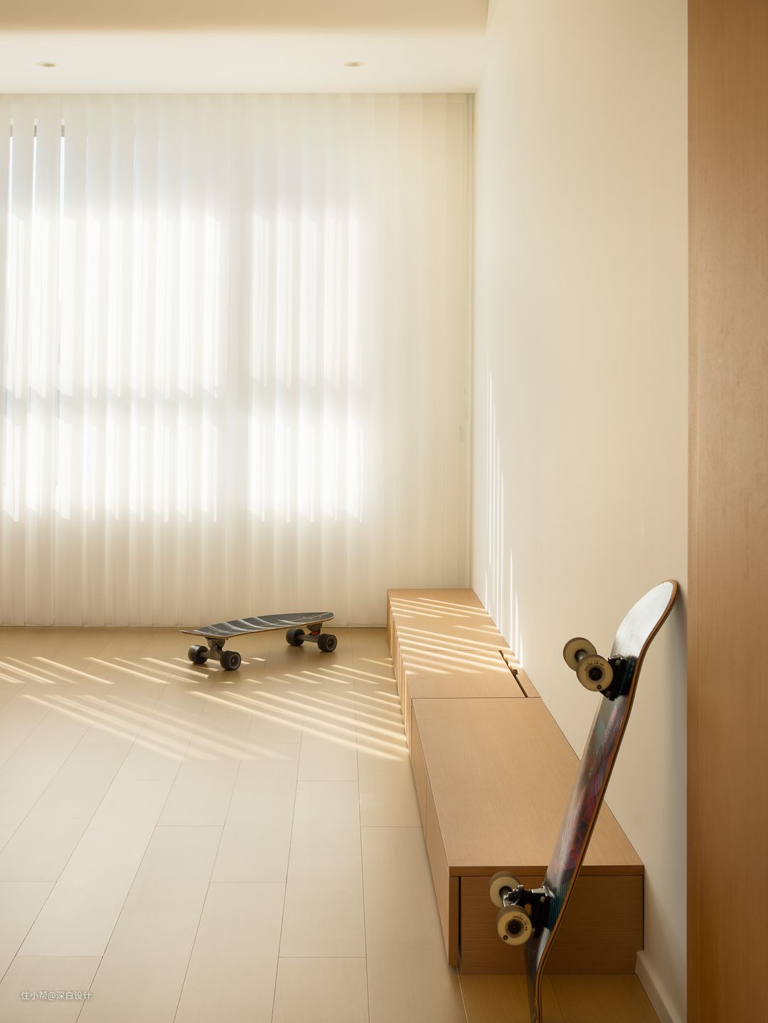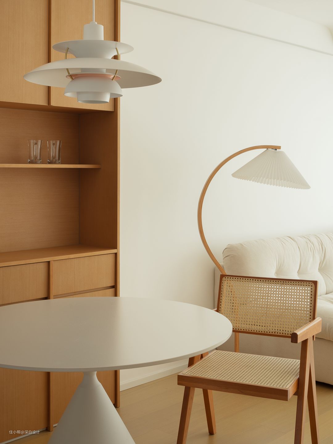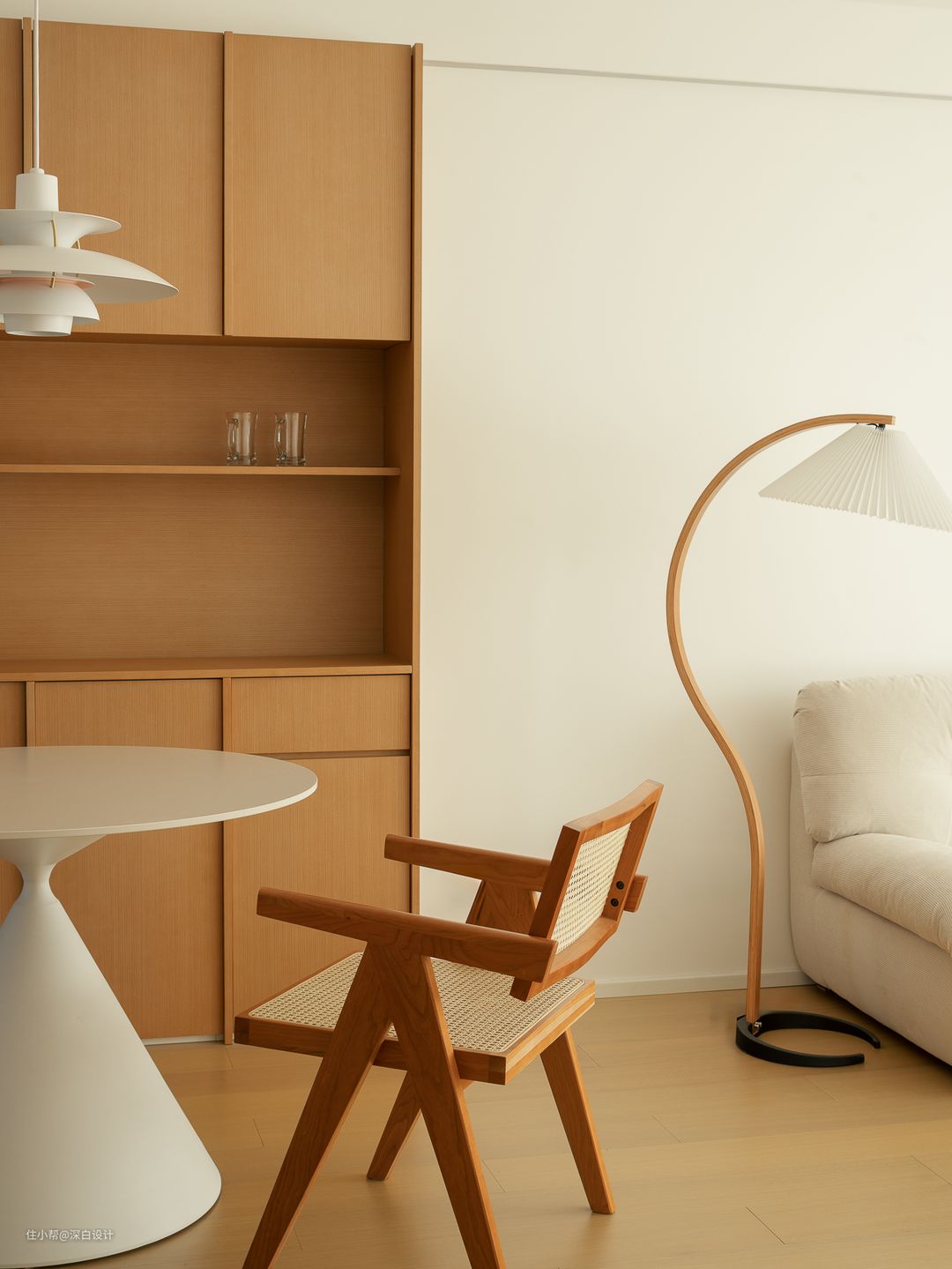 玄关处配备了原木色的穿鞋凳,不仅提供了实用性,也与整体的日系风格相呼应。穿鞋凳旁边,设计师巧妙地采用了白色的隐形门设计,这种设计既增加了空间的整洁感,也使得进入主居区之前的视觉过渡更加自然流畅。