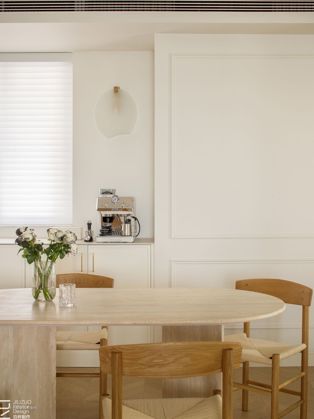 ▲餐厅。餐厅区, 一套木色桌椅成为空间的焦点,其他房间都围绕着餐厅分布,餐桌旁连接着书房、客厅、厨房,俨然成为“家”的中心区域,阅读、用餐、交谈都可以在此处进行。 ▲藤编座椅承载着岁月的记忆,搭配清鱼骨拼木地板,使整个空间充满温情与舒适,营造出家的温馨氛围。 ▲餐边柜与墙面融为一体,使空间更连续,白色墙面带来简约清新的视觉体验,光影透过白色百叶窗化解水吧的拘谨感,空间开阔舒朗。 ▲双开玻璃门隔开了餐厅与书房区域,玻璃保留了透光性,增加了餐厅的明亮度。通过玻璃的透视,保证了区域间的链接。空间之间既相互独立又保持联系。
