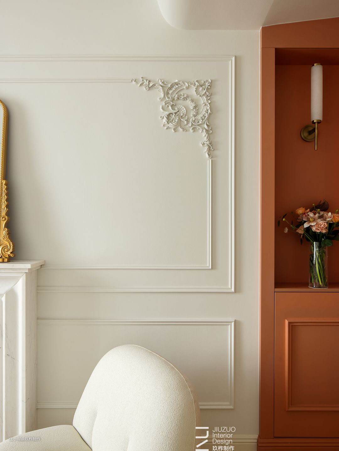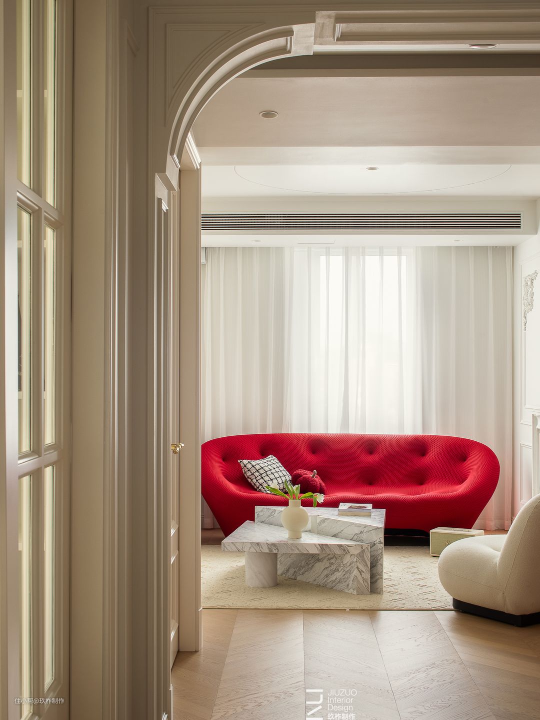 ▲客厅。拆除原有的墙体,房间改为客厅。入门后打造一字横向布局,一道曲线拱门软划分客厅的区域。 ▲大面积落地窗的设计让光线自如地照射室内,辅以白色色调,呈现出梦幻迷离的优雅格局,室内更加温馨浪漫。 ▲蓬松柔软的沙发仿佛云朵一般细腻柔软,茶几采用了错落的大理石拼接,结合了材质的柔与刚,空间内许多小设计,让室内格局更加活泼生动。 ▲一抹红色成为柔白空间中的亮色,如红玫瑰般热烈,上升空间温度,演绎浪漫风情。 ▲天花板无主灯的简约设计拉升层高,视野更为开阔,右侧PU线与角花的设计增加了空间的精致度与法式风情,壁炉洋溢温暖气息。 ▲两侧墙壁通过平衡繁密与极简,营造空间的轻松氛围,让空间停留在恰如其分的恬静优雅中。