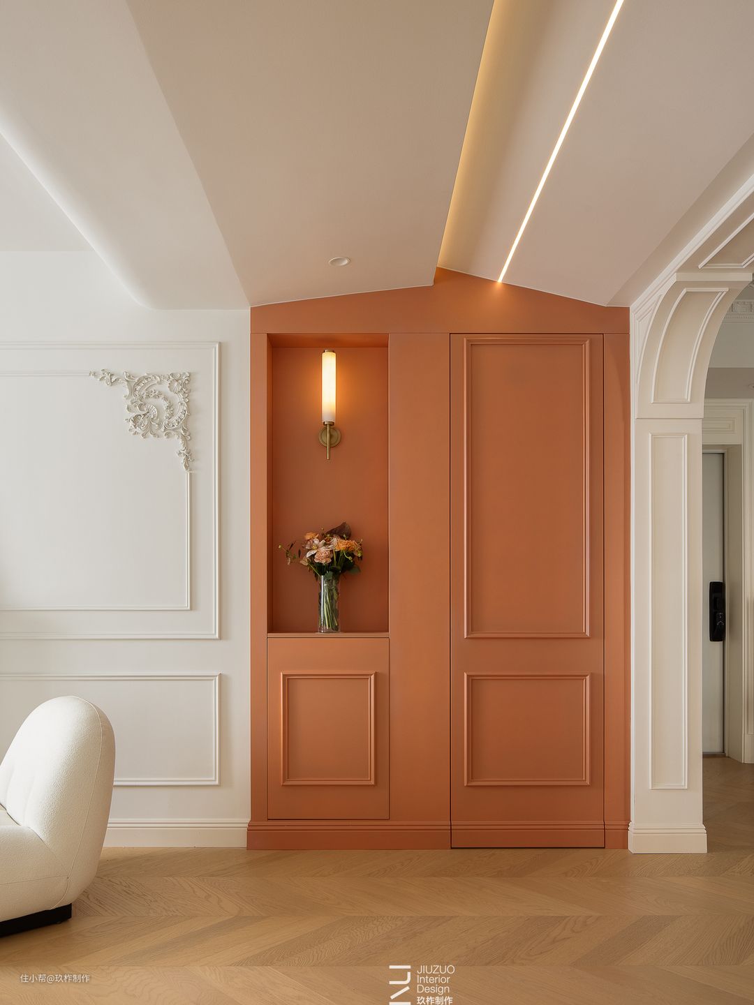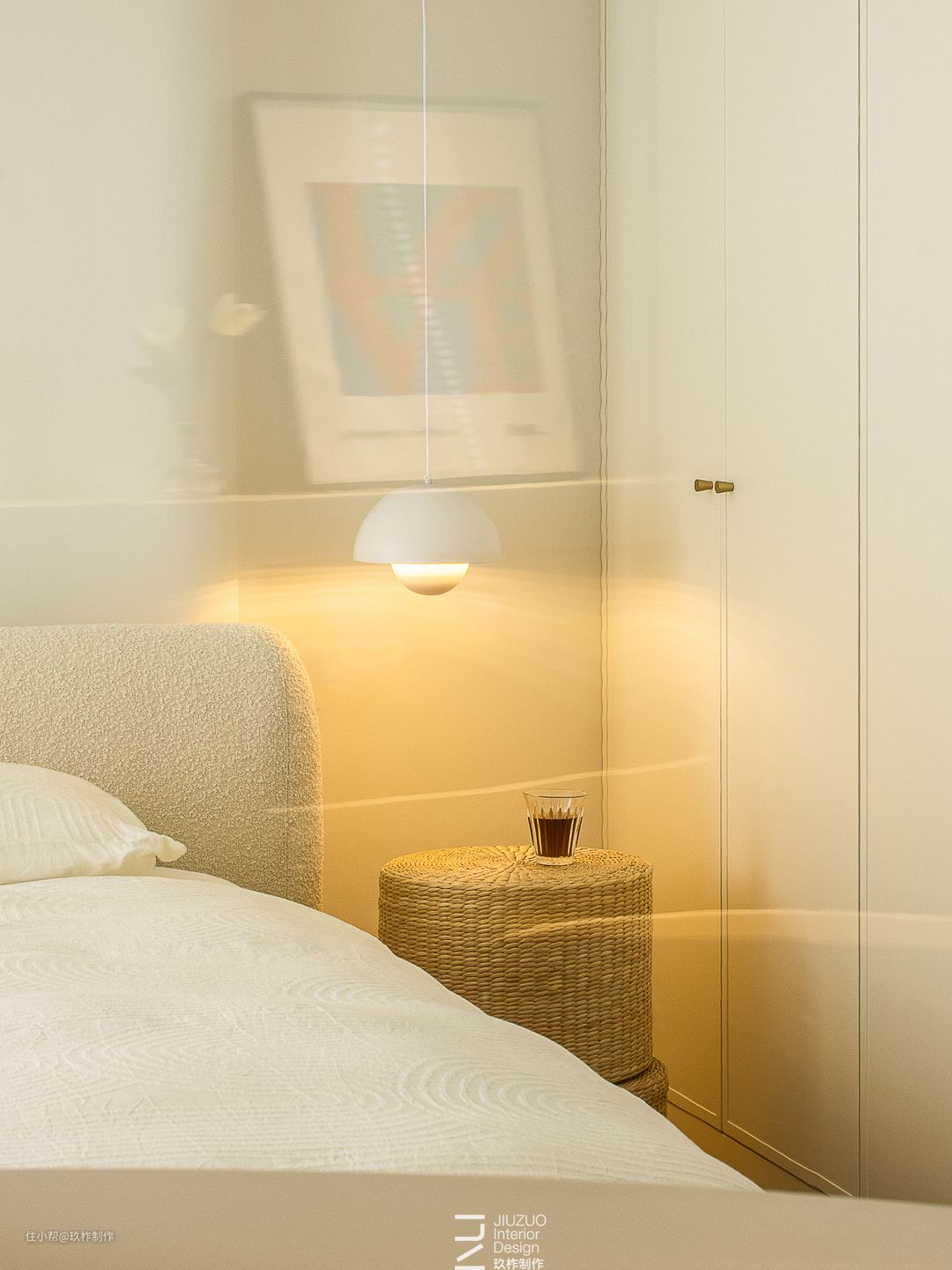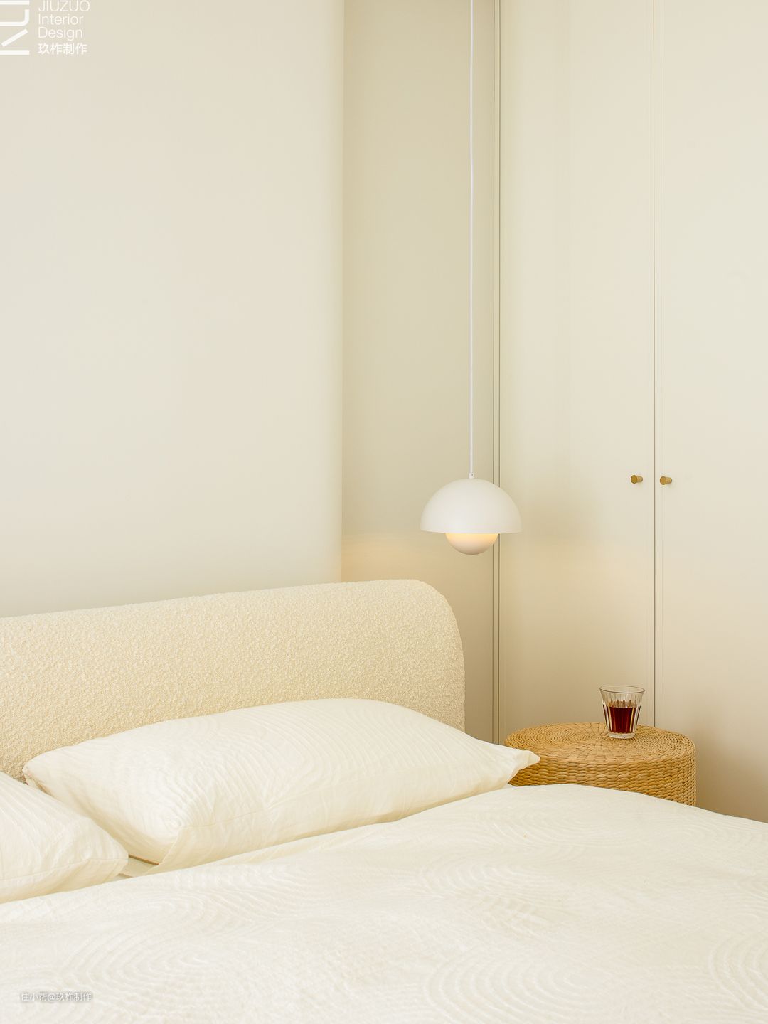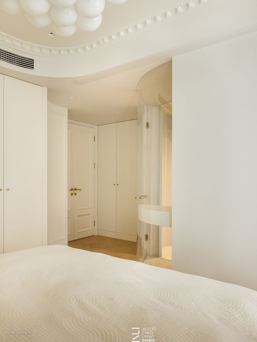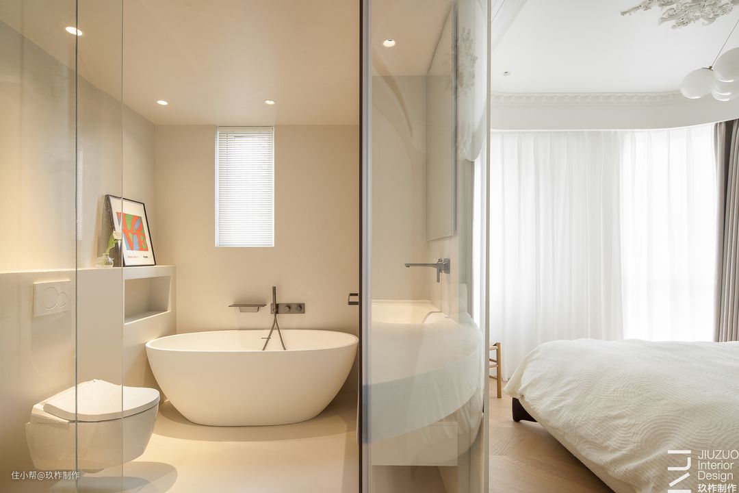 ▲主卧。追寻空间的纯粹本质,以圆弧曲线过渡空间,穿梭于线条之间,流转间凝成优雅的印象,灵动余韵在空间中轻散。 ▲在浴室、天花板、收纳柜处分别采用了弧线设计,为空间注入了柔和感和吸引力。温馨的色彩和曲线相生相成,渲染独特的法式浪漫氛围。 ▲吊灯映射藤编木质的温润,原始质感和自然纹理在环境的渲染下显得质朴婉约。 ▲复古吊灯投射与白色构成共鸣效果。白色主体与暖色灯光营造出更符合本来的温柔氛围。 ▲浴室内柔和的白、暖调的光、玻璃的透,色彩、形状与材质,交融中演绎和谐、平静,邂逅自我的归属感。