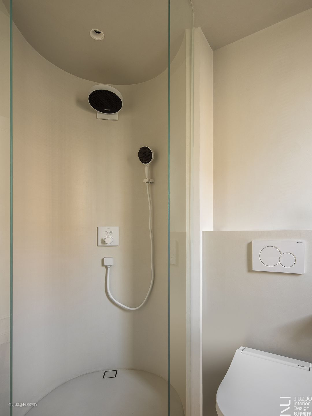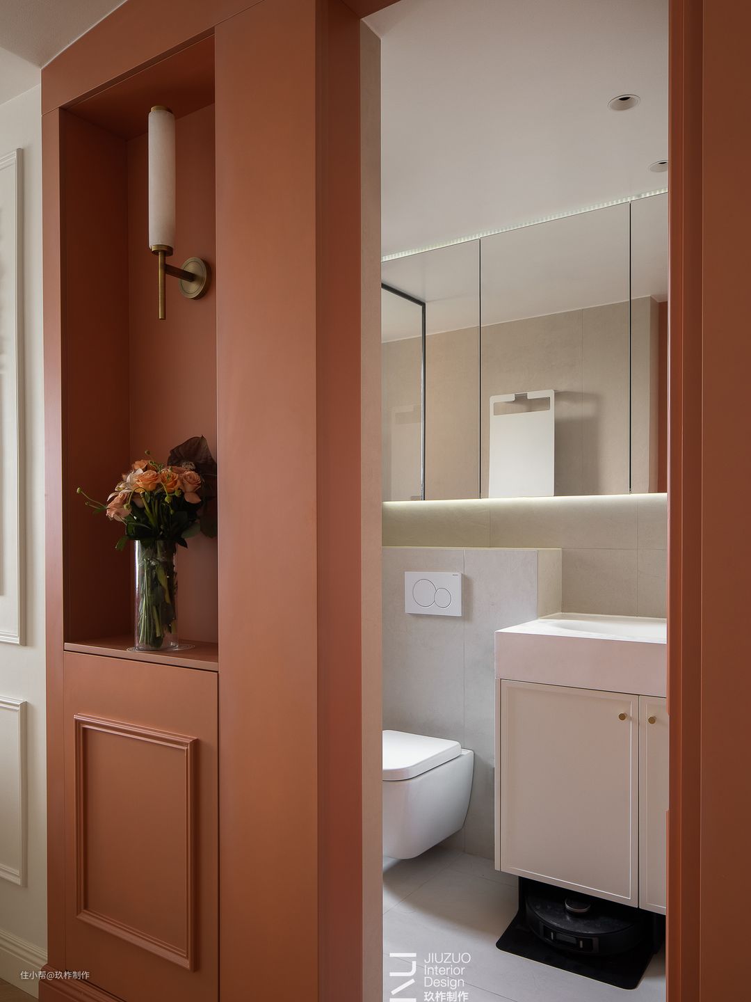 ▲卫生间。浴室门通过色彩、线条自然隐匿于客厅区域旁,使空间更为轻盈整洁,实现视觉上的隐形效果,打造清爽的视觉体验。 ▲拼色设计丰富空间视觉层次,顶部的拱形线条加深空间感,催化空间几何美学的魅力。