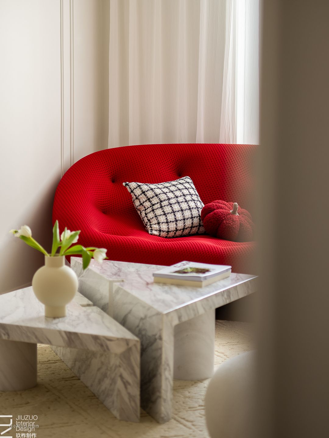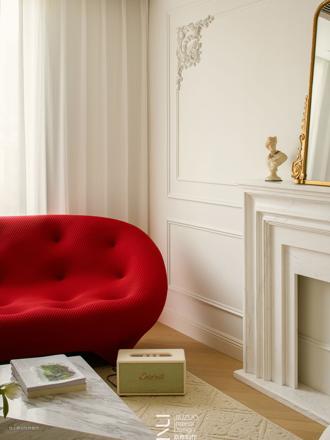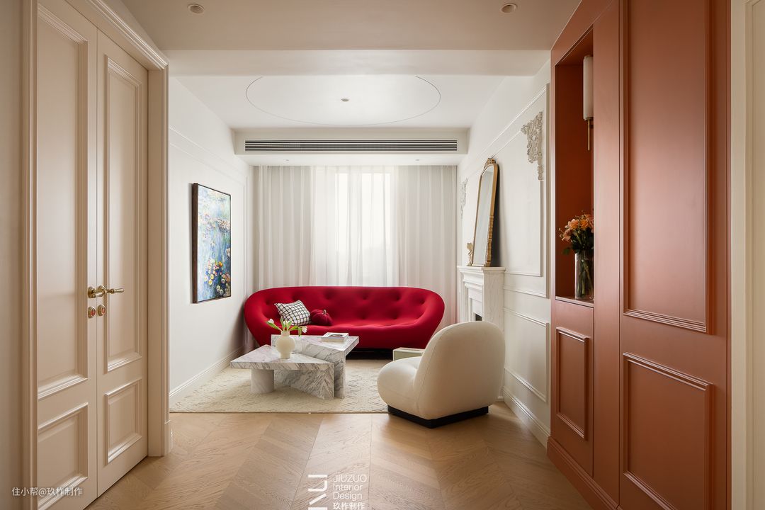 ▲客厅。拆除原有的墙体,房间改为客厅。入门后打造一字横向布局,一道曲线拱门软划分客厅的区域。 ▲大面积落地窗的设计让光线自如地照射室内,辅以白色色调,呈现出梦幻迷离的优雅格局,室内更加温馨浪漫。 ▲蓬松柔软的沙发仿佛云朵一般细腻柔软,茶几采用了错落的大理石拼接,结合了材质的柔与刚,空间内许多小设计,让室内格局更加活泼生动。 ▲一抹红色成为柔白空间中的亮色,如红玫瑰般热烈,上升空间温度,演绎浪漫风情。 ▲天花板无主灯的简约设计拉升层高,视野更为开阔,右侧PU线与角花的设计增加了空间的精致度与法式风情,壁炉洋溢温暖气息。 ▲两侧墙壁通过平衡繁密与极简,营造空间的轻松氛围,让空间停留在恰如其分的恬静优雅中。
