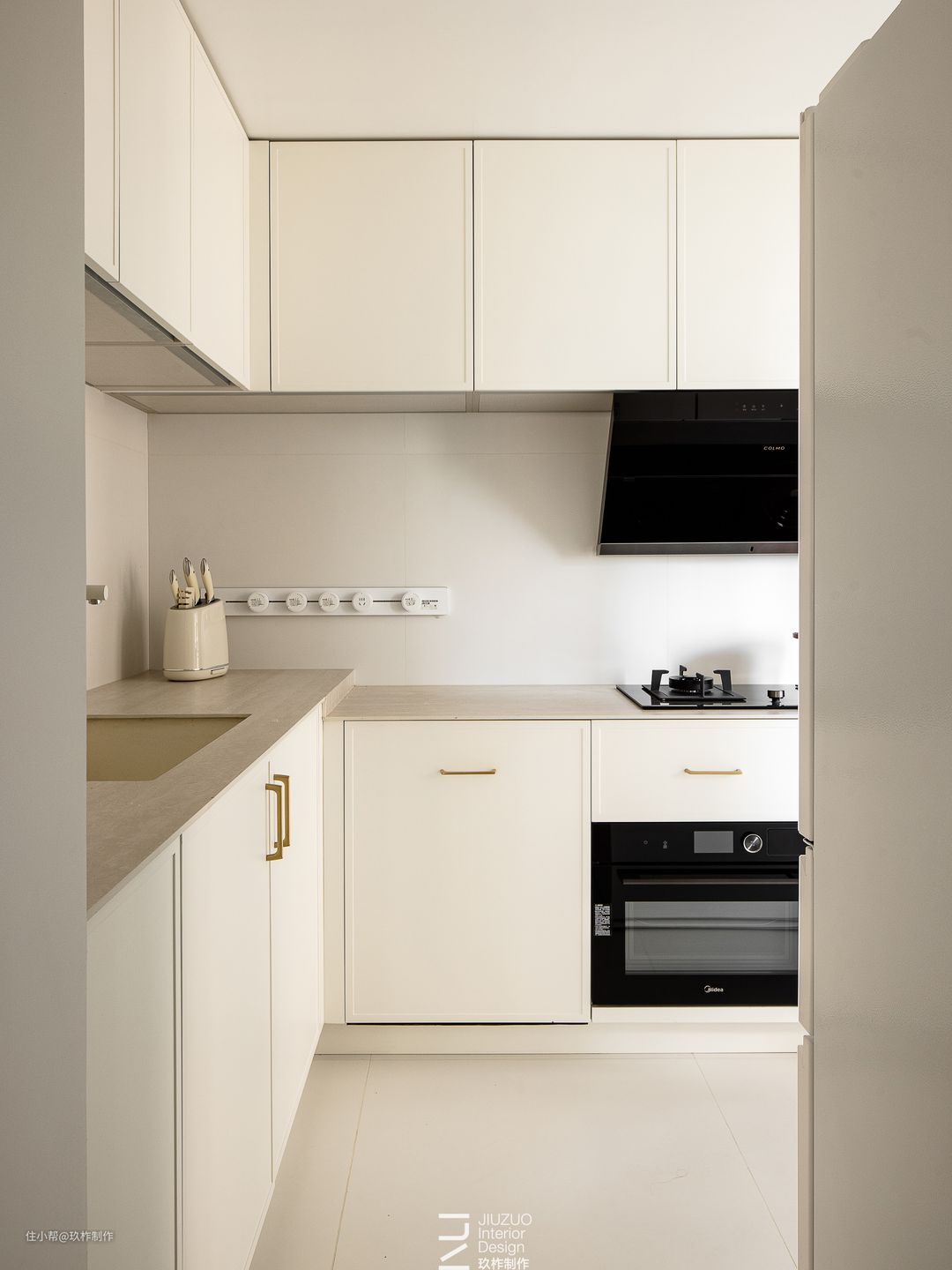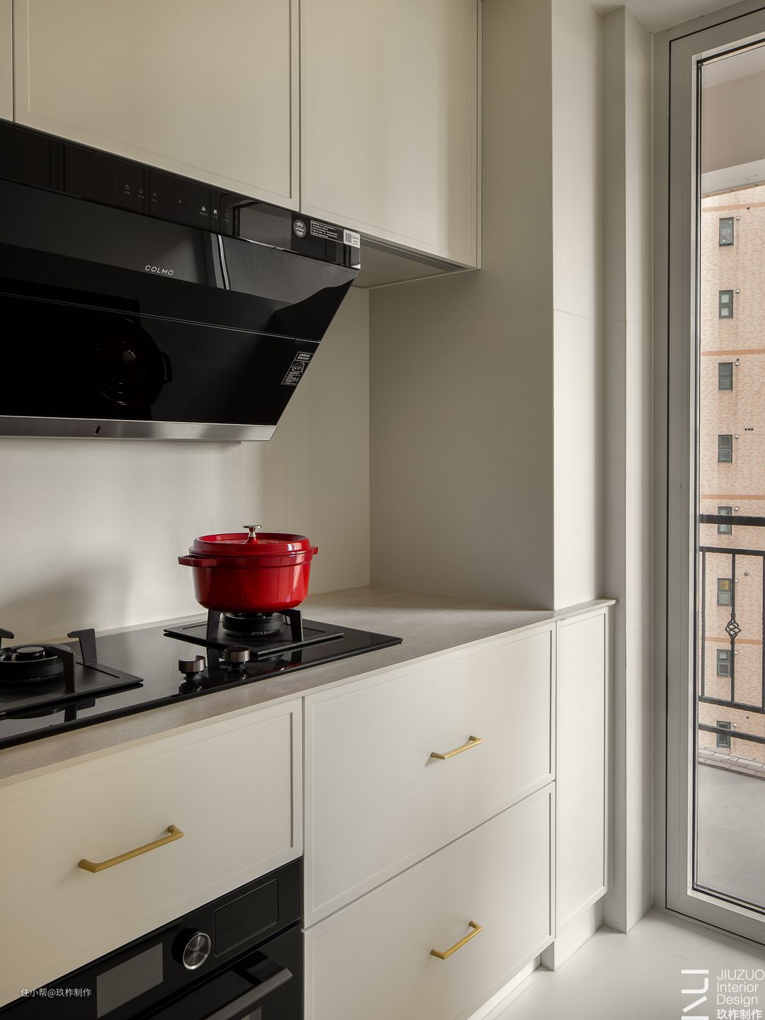 ▲厨房。奶油白色作为厨房的主色调,大面积浅色配合阳台,厨房空间开阔明亮,透露出空间当中的单纯性。 ▲定制橱柜让空间更整洁,“U”形设计打造流畅的拿、洗、切、炒烹饪动线,让烹饪更从容、空间更轻盈,烟火更缥缈。