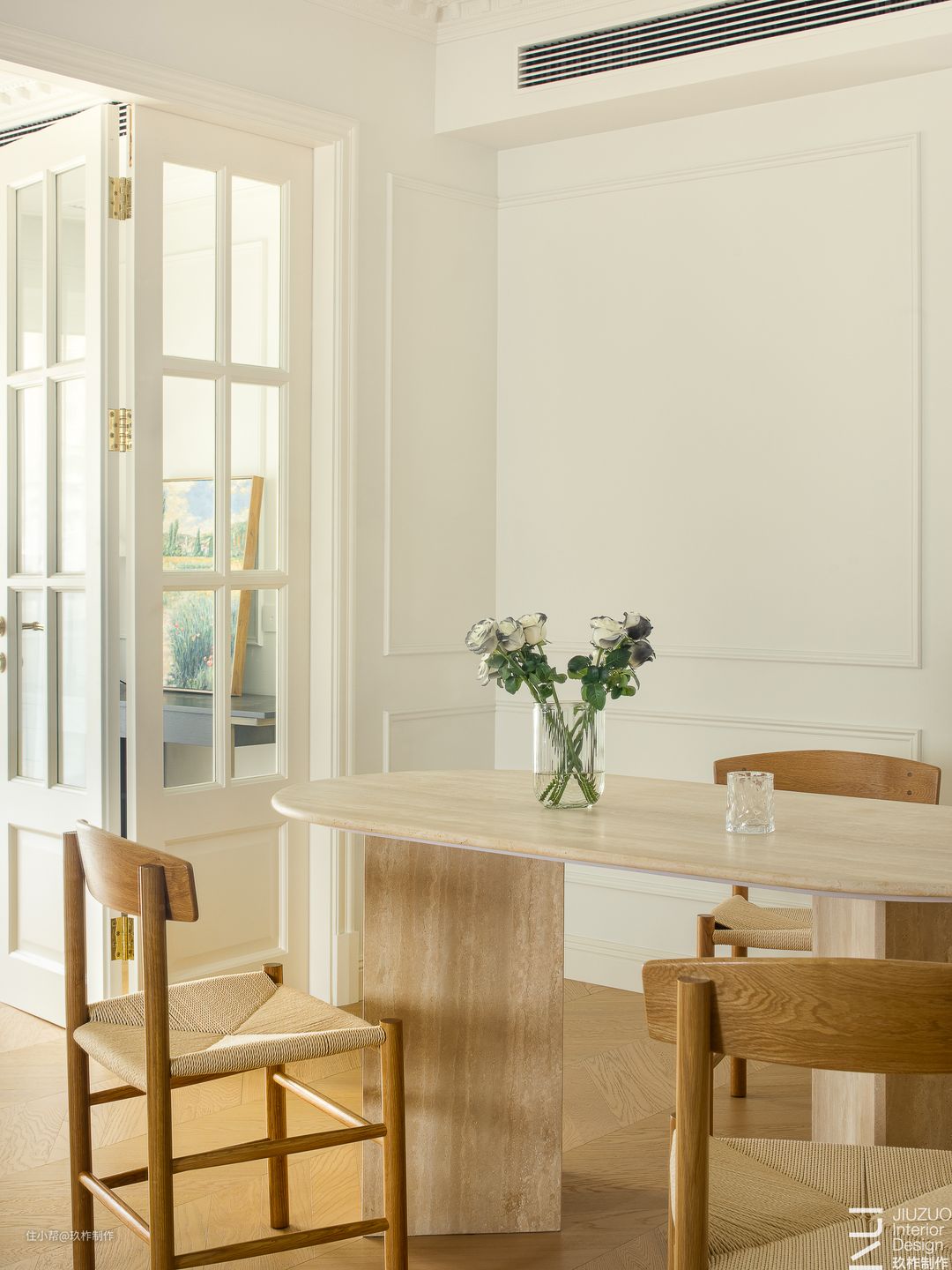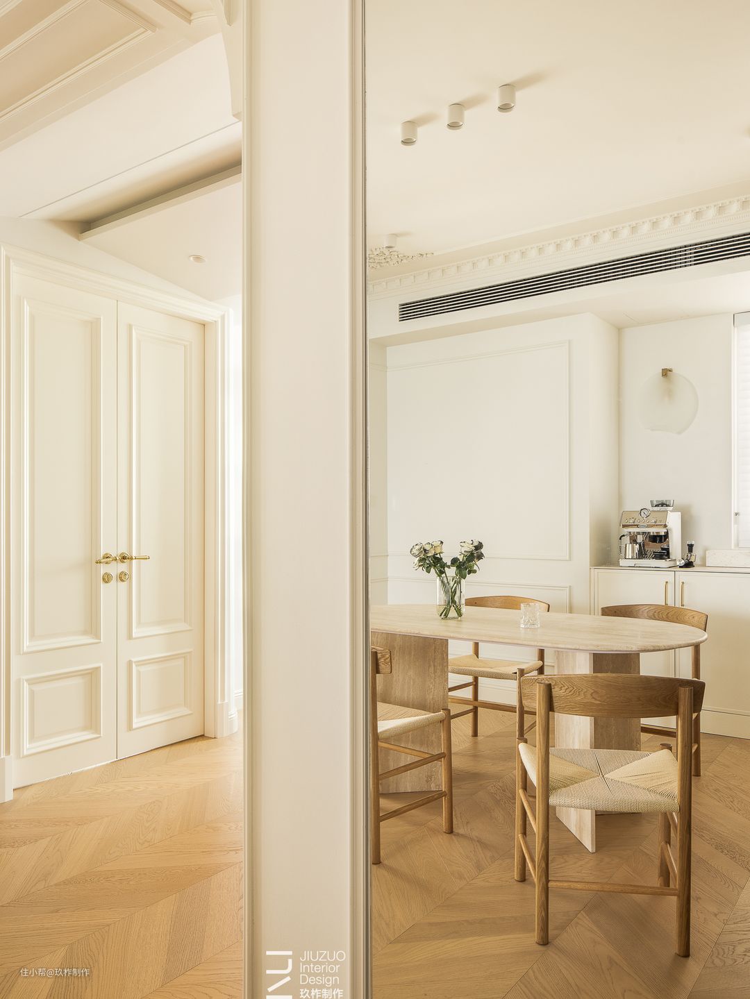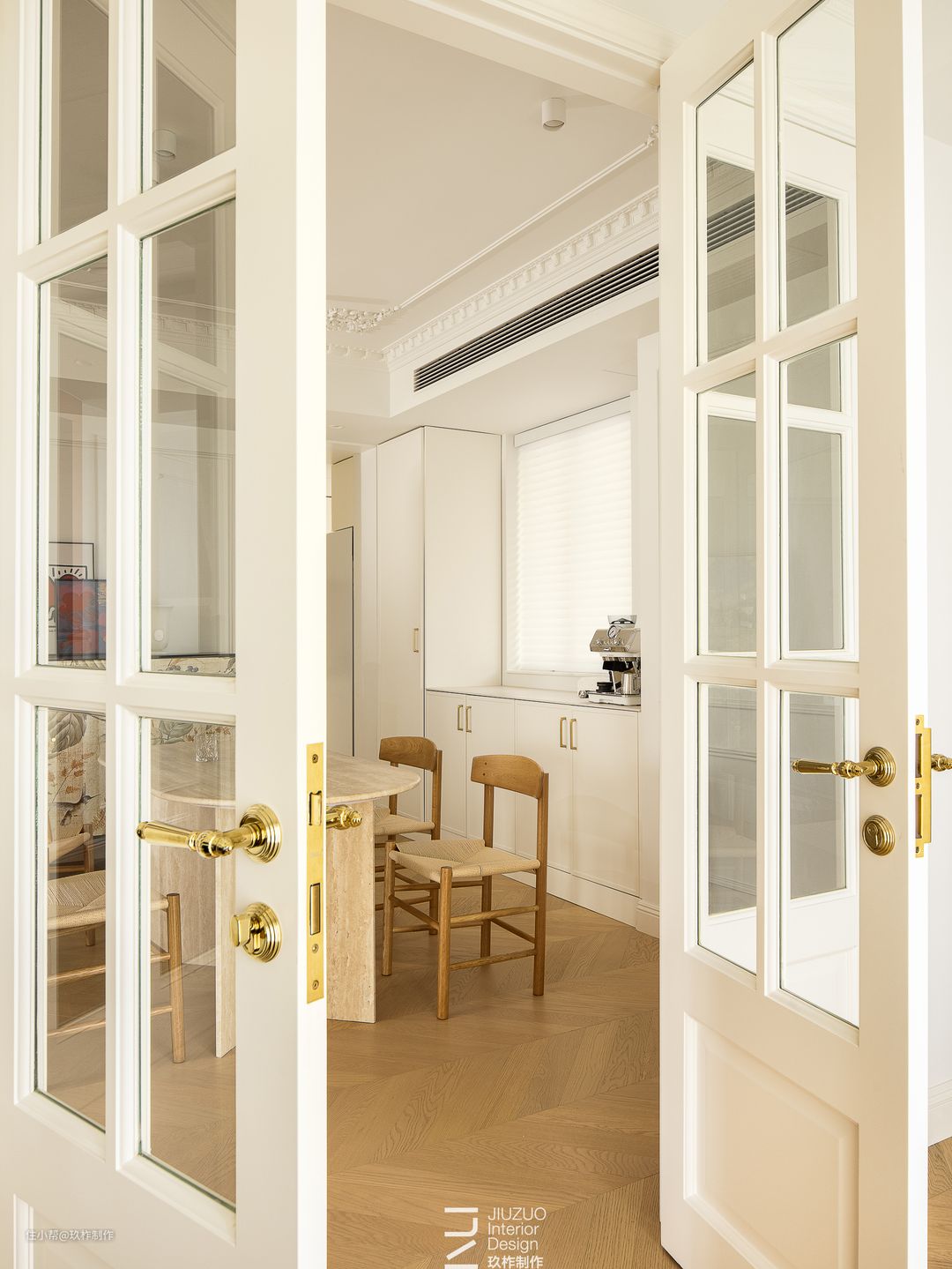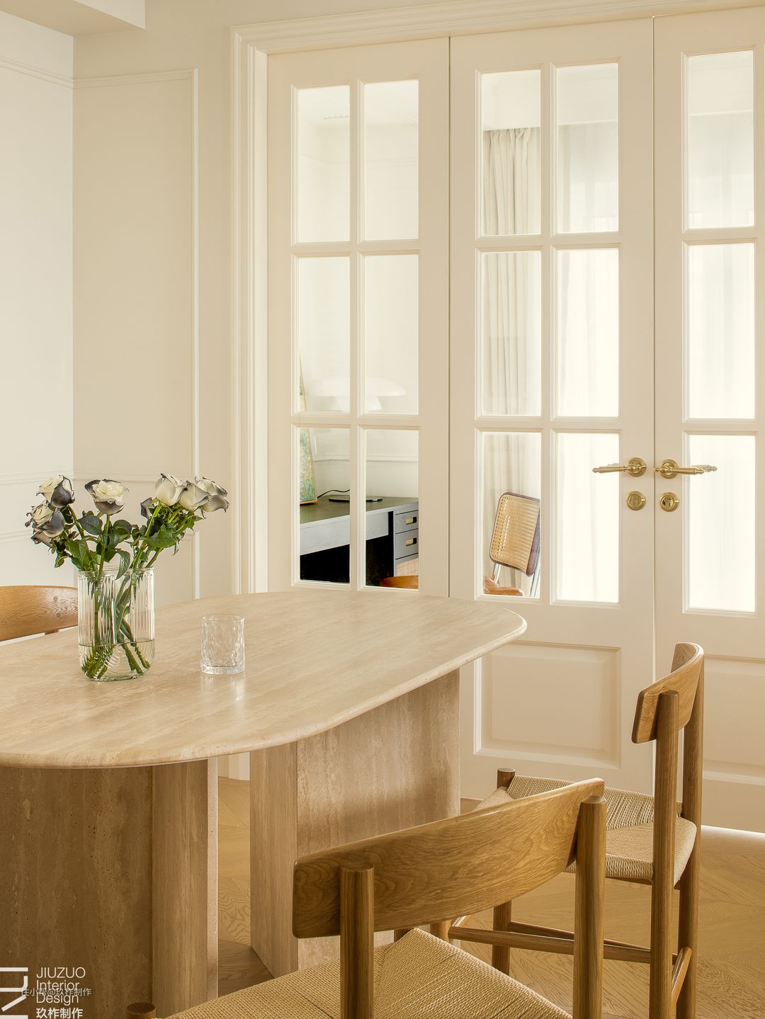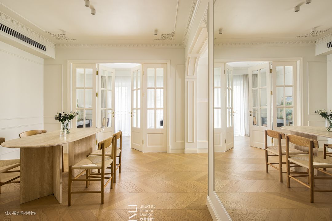▲餐厅。餐厅区, 一套木色桌椅成为空间的焦点,其他房间都围绕着餐厅分布,餐桌旁连接着书房、客厅、厨房,俨然成为“家”的中心区域,阅读、用餐、交谈都可以在此处进行。 ▲藤编座椅承载着岁月的记忆,搭配清鱼骨拼木地板,使整个空间充满温情与舒适,营造出家的温馨氛围。 ▲餐边柜与墙面融为一体,使空间更连续,白色墙面带来简约清新的视觉体验,光影透过白色百叶窗化解水吧的拘谨感,空间开阔舒朗。 ▲双开玻璃门隔开了餐厅与书房区域,玻璃保留了透光性,增加了餐厅的明亮度。通过玻璃的透视,保证了区域间的链接。空间之间既相互独立又保持联系。