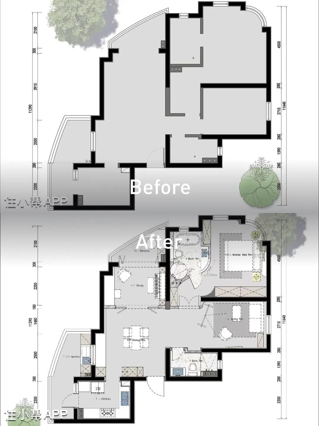改造后设计亮点: 1. 拆除墙壁,将原有的次卧改造为客厅,实现客餐一体式开放布局,空间开阔,光线明亮; 2. 将餐厅区域原有的纵向开放式布局划分至书房与餐厅,丰富空间功能性; 3. 书房连通阳台,双开门设计可灵活切换开放状态,与客餐厅打造开阔、功能丰富的公共区域空间; 4. 客餐厅、书房实现“L”型布局,入门视野开阔,极大的改善了通风、采光条件; 5. 主卧采用曲线设计,线条流畅,使空间过渡更自然;玻璃隔断使视野更开阔。