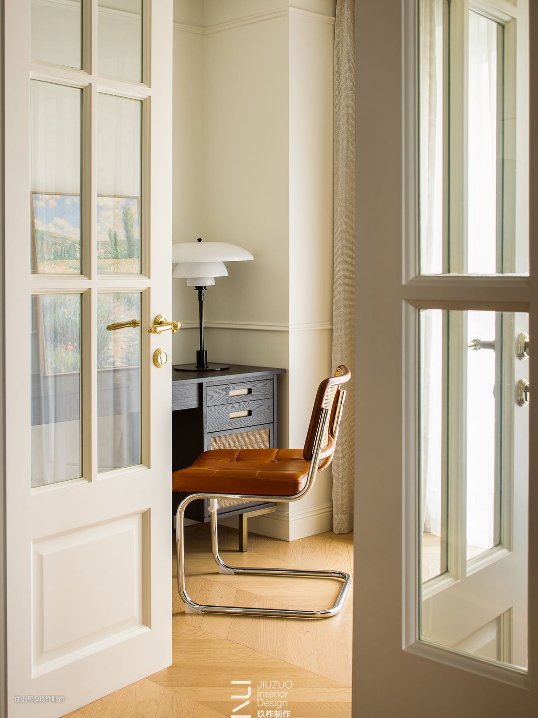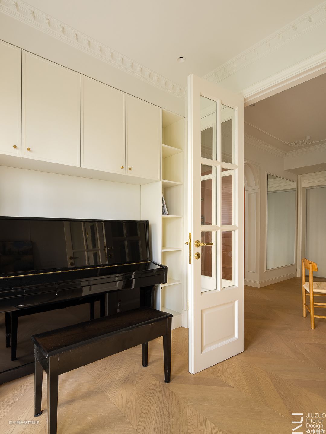 ▲书房。推开双开门,洋溢法式浪漫因子的书房出现在眼前,书房连通阳台,一侧放置书桌,阅读与办公有了宁静的天地,另一侧放置钢琴,在空间里演绎优雅的序曲,对生活的热爱永远存在。