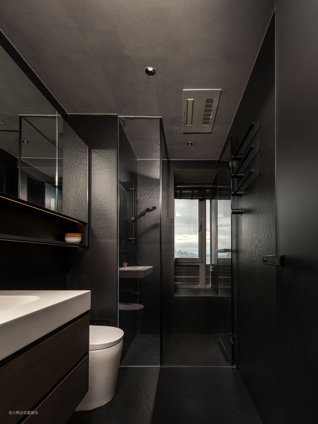 整个卫生间整体以高级黑色调为主,硬装运用富有肌理墙砖地砖通铺,为空间增添神秘和艺术的气息,白色智能马桶+习洗漱柜台面,为此空间留又喘息的空间,将自然的粗犷与生活的温柔巧妙柔和