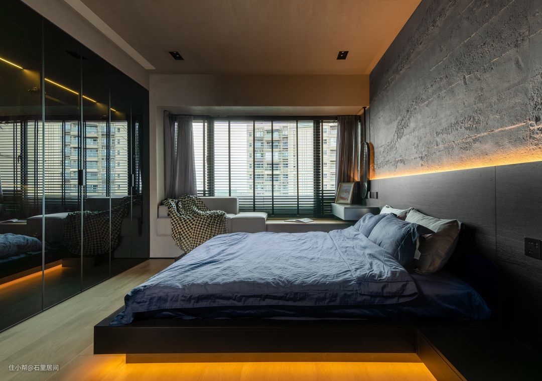 整排衣柜的设计,让储藏衣物的空间最大化,加之黑色+灯带设计~床尾安装投影仪,结合黑色衣柜作为投影仪背景墙,可以在舒适的床上欣赏电影,打造沉浸式体验。 黑色与磨砂质感灰泥土自然质朴,灰泥雅晶石质感砂艺术涂料作为床头背景墙设计,自带肌理感,搭配上内嵌式灯带,仿若月球质感,全方位彰显屋主独特品味