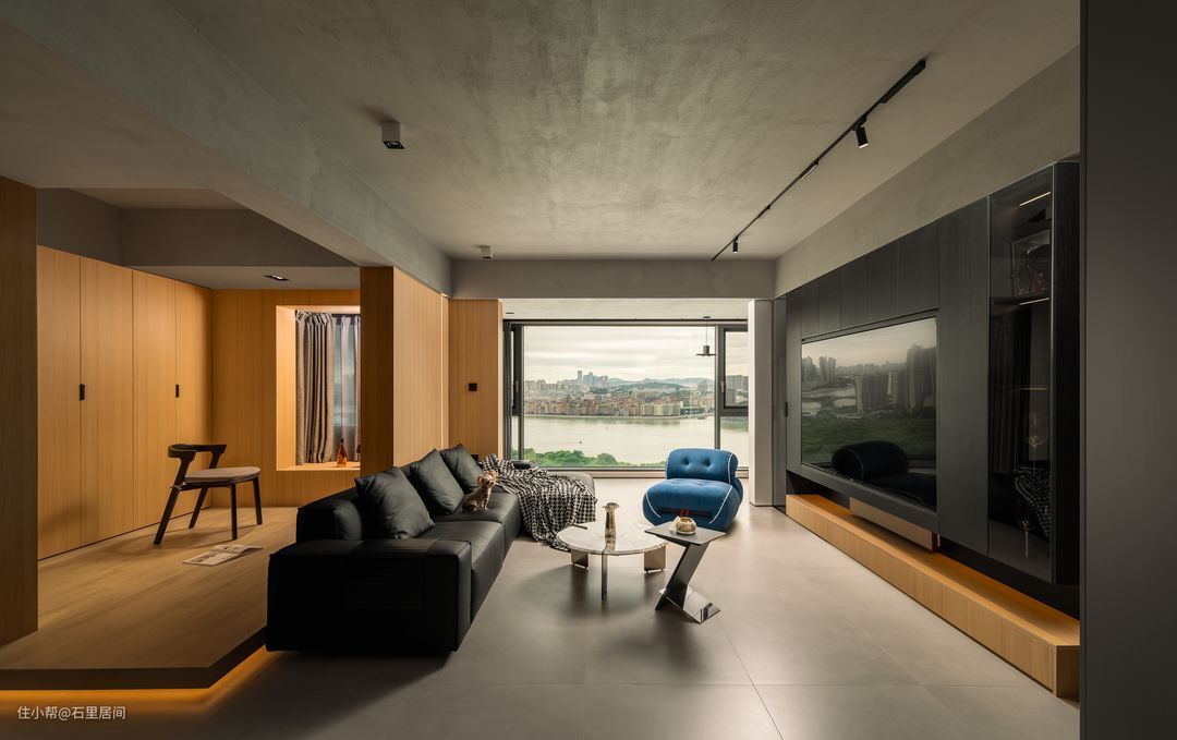 灰黑色整面电视背景墙的摆件与黑木纹映入眼帘,里侧嵌入的灯带,光影柔和错落,吊顶墙面水泥灰纹理质感搭配大理石地砖,加之皮革沙发,家中又增添粗犷不羁的气质,一侧蓝色系懒人沙发,在此空间使得视觉更有冲击力