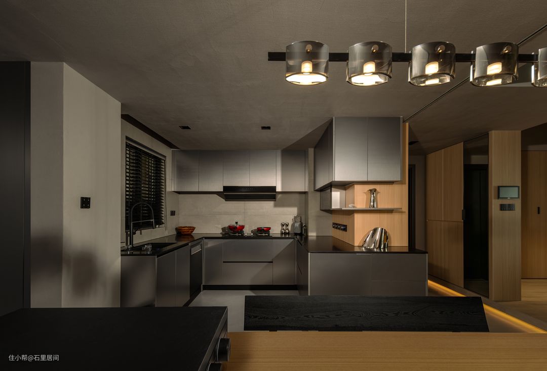 厨房整体上呈现U字型布局,黑色的台面,银灰色的柜身,两者之间的平衡,体现相互渗透从而丰富空间的层次变化,水槽设置靠一侧,便于通风,避免受潮,烹饪区与清洗区各放一边,聚会等也能享受一边多人备料,清洗食物,感受轻松居家的乐趣