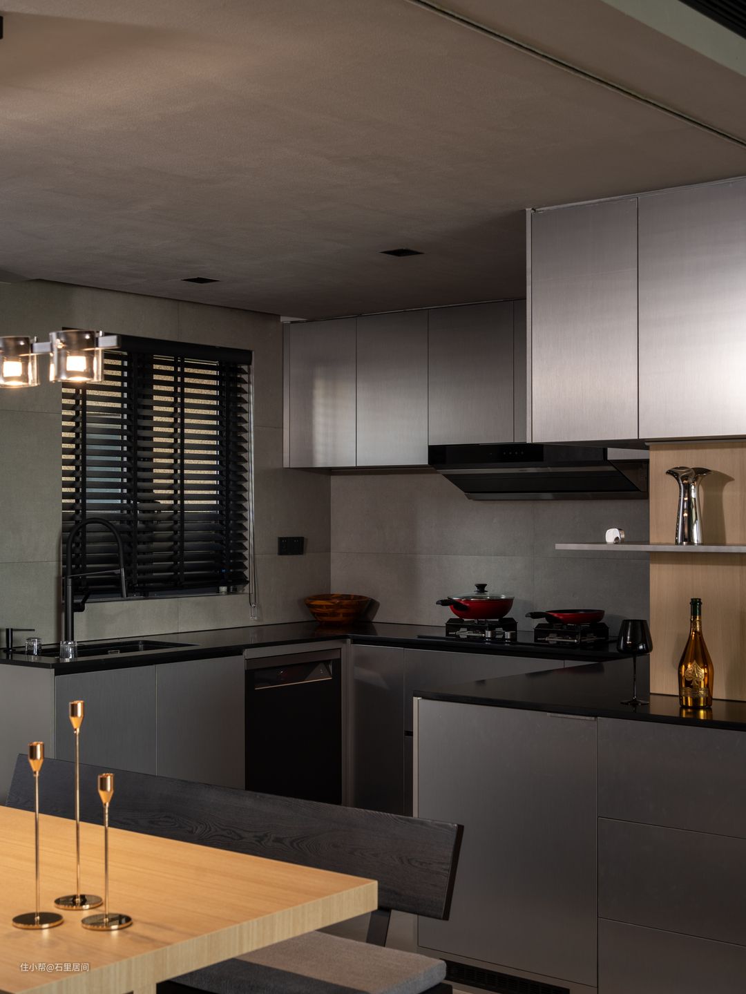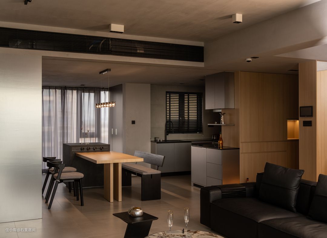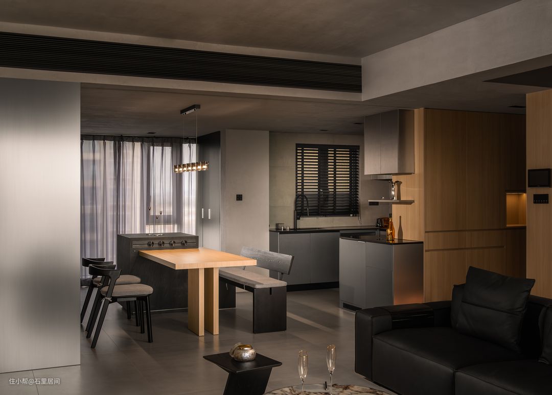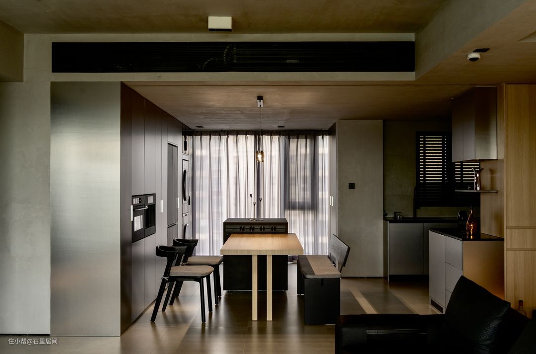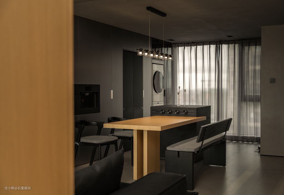 餐桌放置靠窗,自然光透过纱帘,形成迷离光影,增添餐厅氛围。原木与黑色相结合,是整个餐厅工业化风格调性的真实写照,黑木纹餐椅材质与餐桌连接岛台,与整屋的黑暗风格调相得益彰,