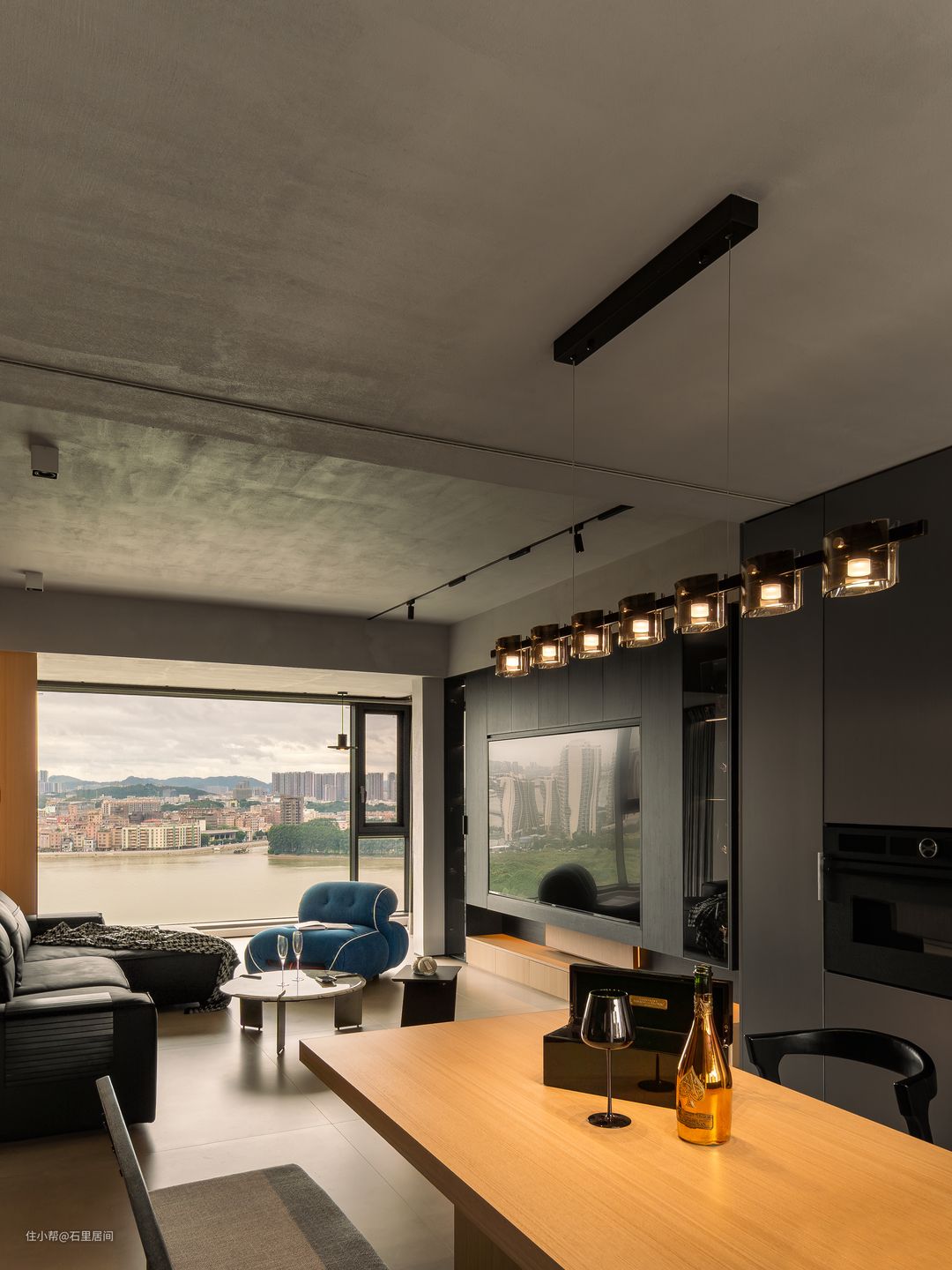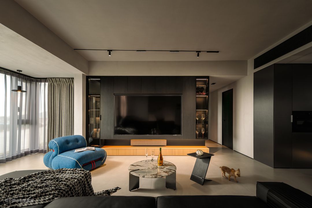 灰黑色整面电视背景墙的摆件与黑木纹映入眼帘,里侧嵌入的灯带,光影柔和错落,吊顶墙面水泥灰纹理质感搭配大理石地砖,加之皮革沙发,家中又增添粗犷不羁的气质,一侧蓝色系懒人沙发,在此空间使得视觉更有冲击力