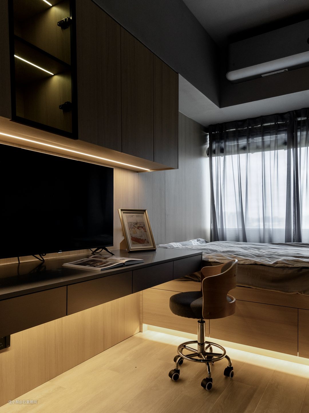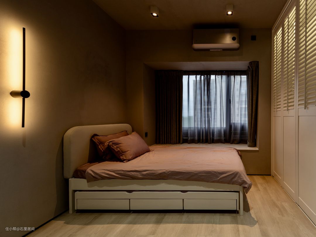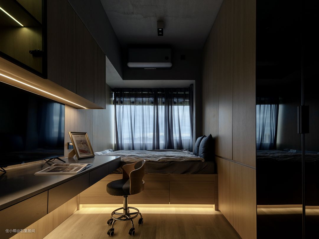 卧室作书桌+学习椅考床,流畅的动线设计,睡眠区,学习区,储物区处于同一动线上,独立互不干扰,贴合日常学习所,榻榻米靠窗定制,黑纱作为遮挡,沉静的色调呈现安静温暖