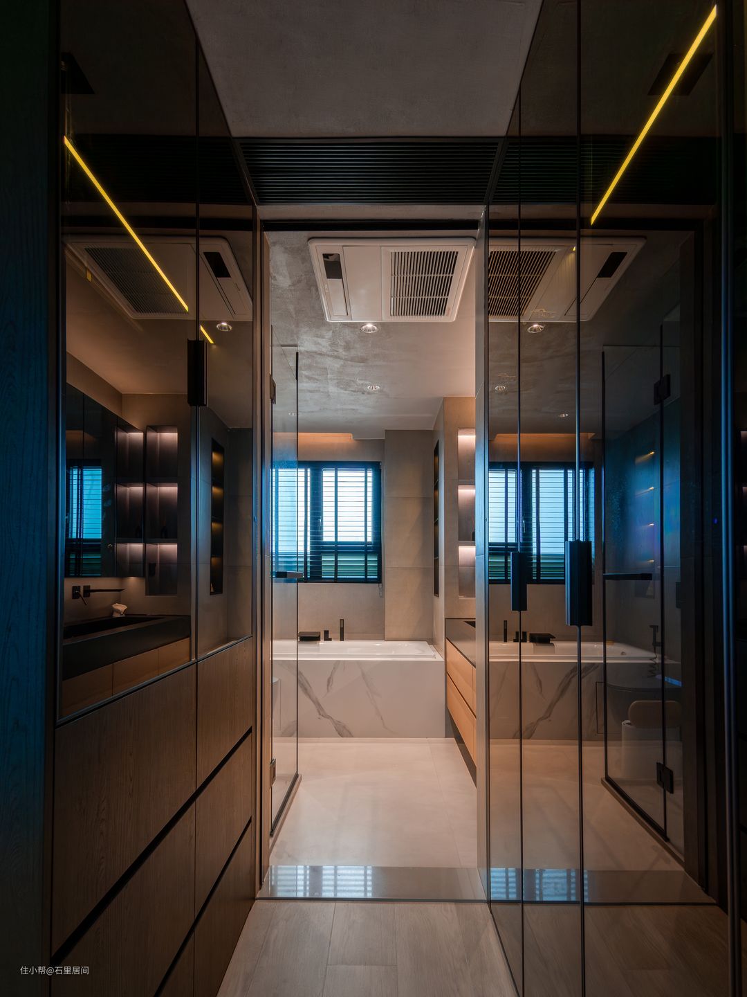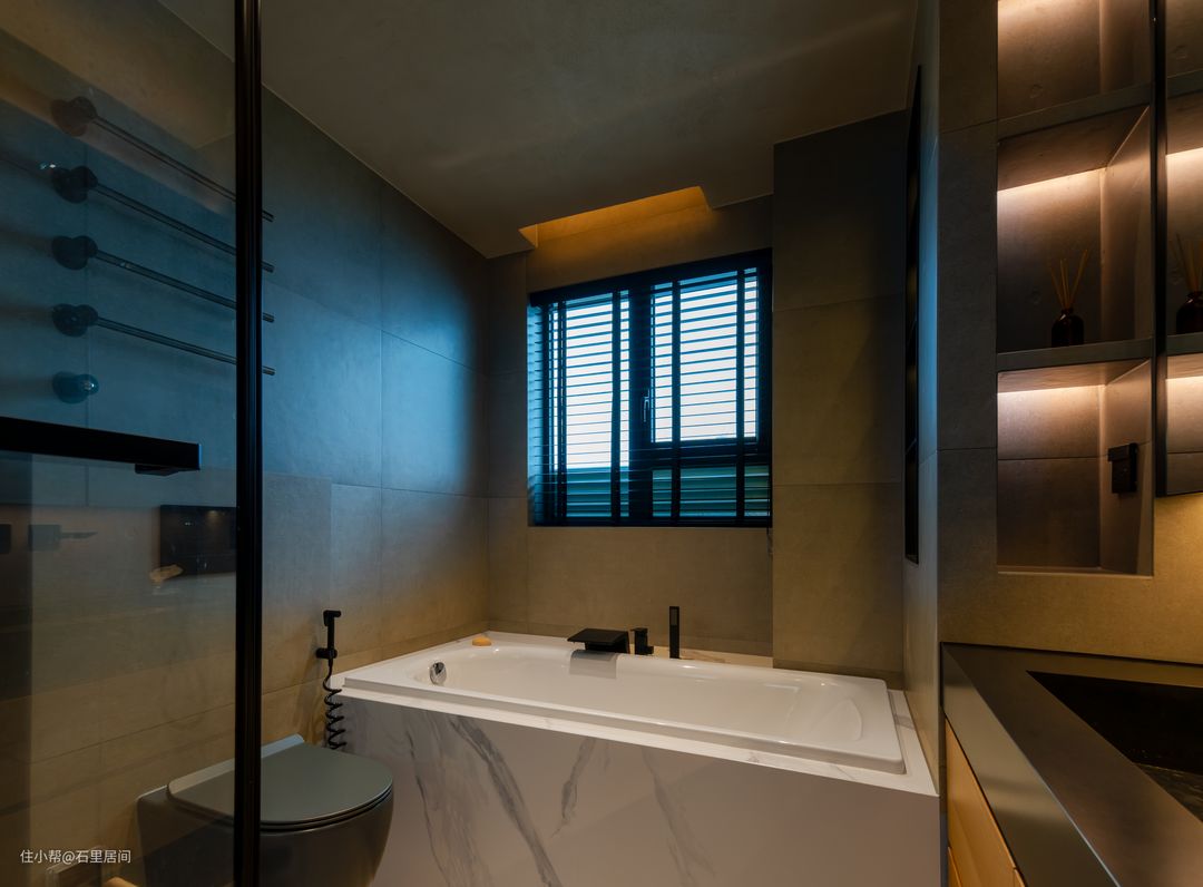 主卧独立卫生间自带轻奢冷峻的气质,延着衣柜区域放眼望去,大理石瓷砖将墙面地面完全包裹整体性纵深感更加强烈。显露一角的洗漱柜原木材质拥有较大台面可容纳使用。墙面壁龛式设计能够有效将洗漱用品收纳于无形,灯带的辅助增添一丝灵动的元素,为卫生间营造清雅柔美的氛围