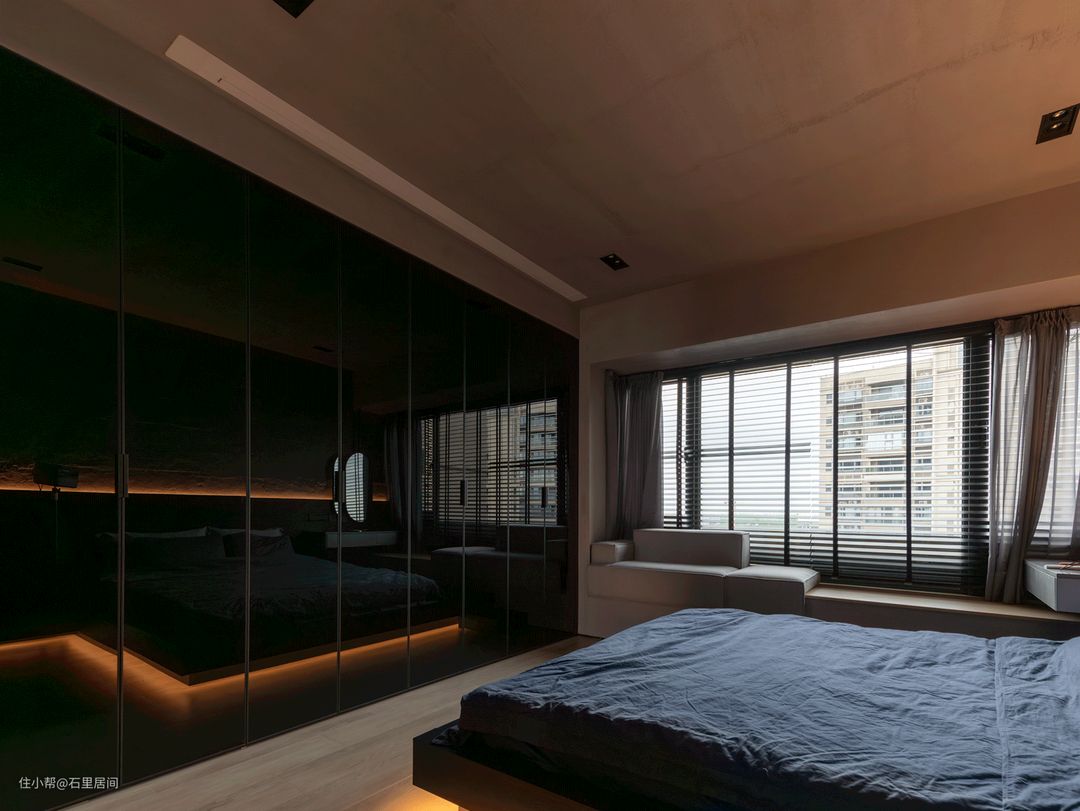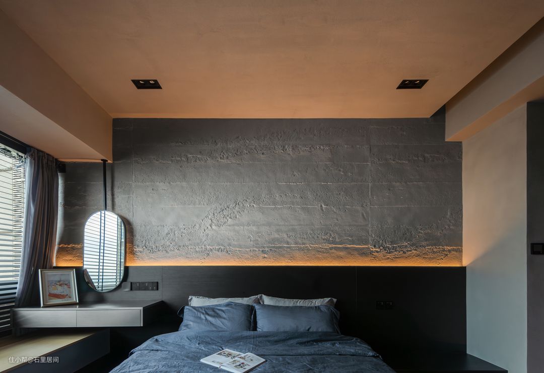 整排衣柜的设计,让储藏衣物的空间最大化,加之黑色+灯带设计~床尾安装投影仪,结合黑色衣柜作为投影仪背景墙,可以在舒适的床上欣赏电影,打造沉浸式体验。 黑色与磨砂质感灰泥土自然质朴,灰泥雅晶石质感砂艺术涂料作为床头背景墙设计,自带肌理感,搭配上内嵌式灯带,仿若月球质感,全方位彰显屋主独特品味