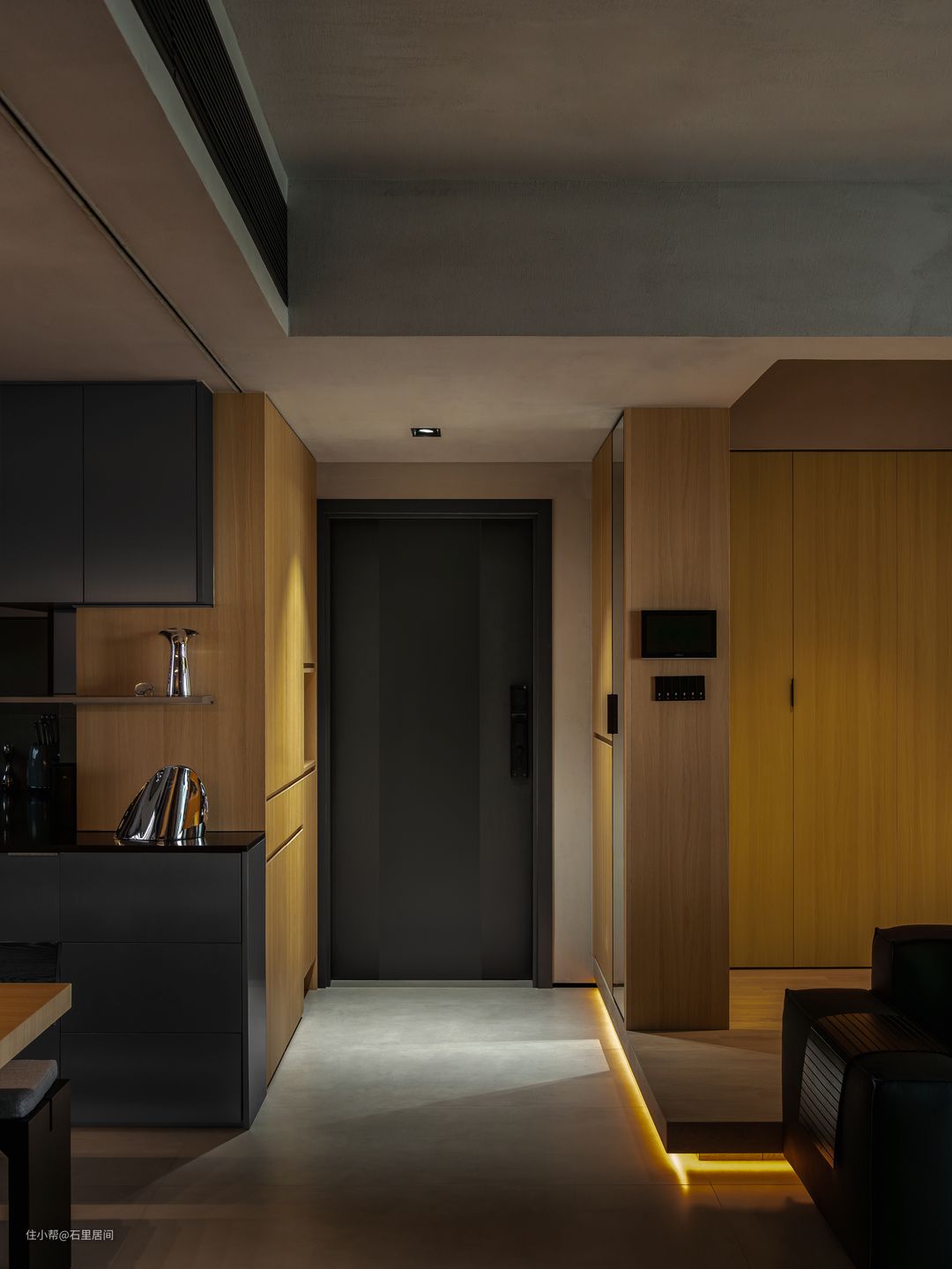 从玄关进入,独有的印象屏蔽掉了常见的一切冗余,在设计中做减法,原木玄关柜,内嵌式筒灯,高级黑质感等,缪缪数笔勾勒出屋主回家的第一路线。灰色质感的地砖搭配整体,随性中透着个性