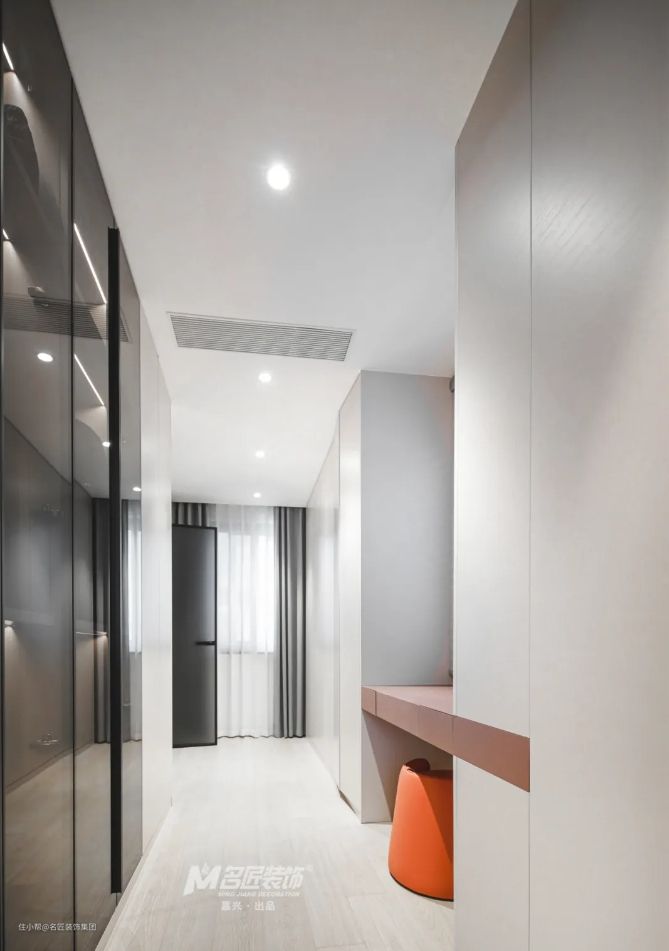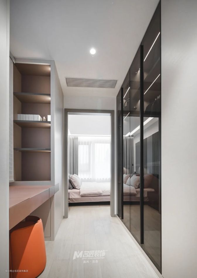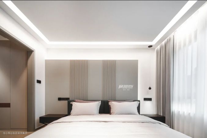 主卧灰色格栅背景墙不仅为卧室带来质感和深度,床头的边吊是一种优雅的照明选择,能够提供充足的光线,同时也增强房间的现代感。 将主卧与衣帽间相连,采用开放式的入口,空间更流畅性和宽敞,同时给业主提供一个实用而私密的空间,便于更衣和梳妆。 考虑到背景墙和边吊的现代感,床品选择了柔和的米白色,平衡整体色彩。
