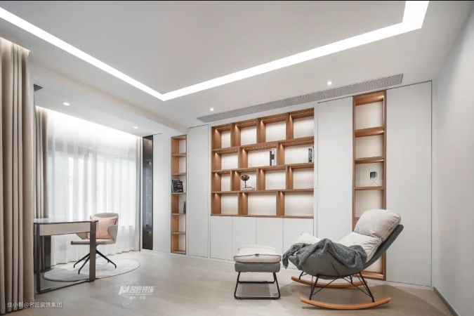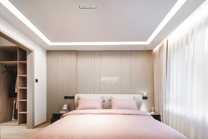1、香槟色格栅背景墙为次卧带来温暖的色调和质感,同时增加了空间的深度。 2、皮质床头,不仅增添舒适度,还能与香槟色格栅背景墙相协调,增加房间的奢华感。 3、采用粉色床品,如床单、被套和抱枕等等,为次卧增添一抹柔和的色彩,创造一个温馨而舒适的睡眠环境。 4、房间内的定制柜可以提供充足的储存空间,同时保持整体设计的一致性。选择原木色的柜格,并暗藏灯带,增加了设计的趣味性。柜门采用米白色,与墙面和床品的颜色相协调,保持了整体设计的简洁和统一。米白色有助于反射光线,使房间看起来更加明亮和宽敞。