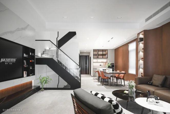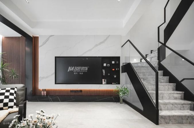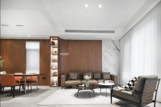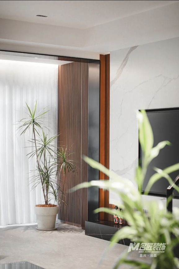 1、无主灯设计可以通过多个照明点如筒灯、壁灯等来提供均匀而富有层次的光线,创造出轻松舒适的氛围。 2、落地玻璃窗搭配白色窗纱,落地窗不仅可以提供充足的自然光照明,增强空间的开阔感。 3、采用原木纹理护墙板与大理石纹岩板拼接,这种设计结合了自然原木的温暖和大理石的质感。 4、电视背景墙采用大片岩板背景搭配木纹格栅,木纹格栅的加入提供了一定的纹理和温暖感,避免了过于冷漠的石材感觉。